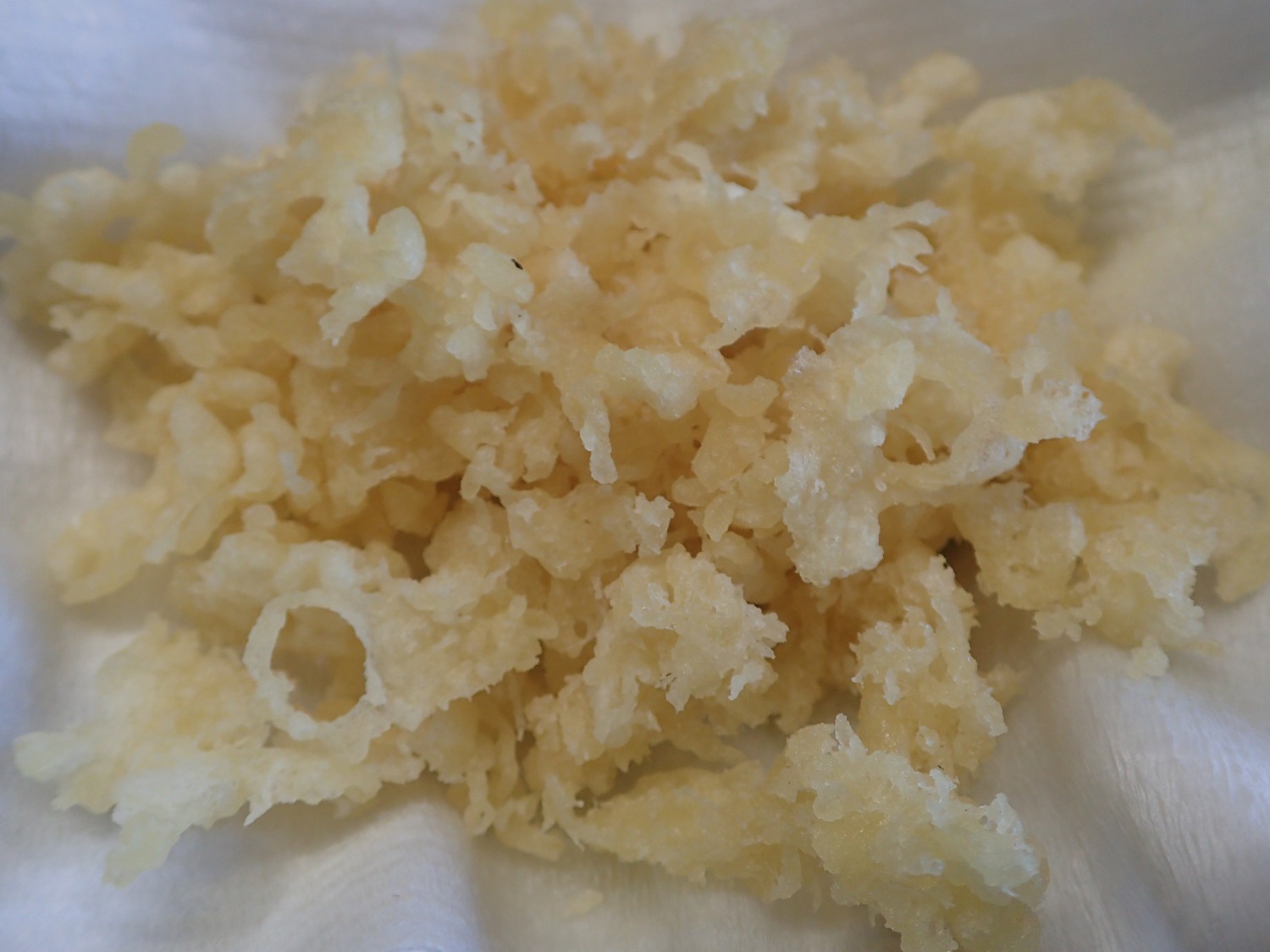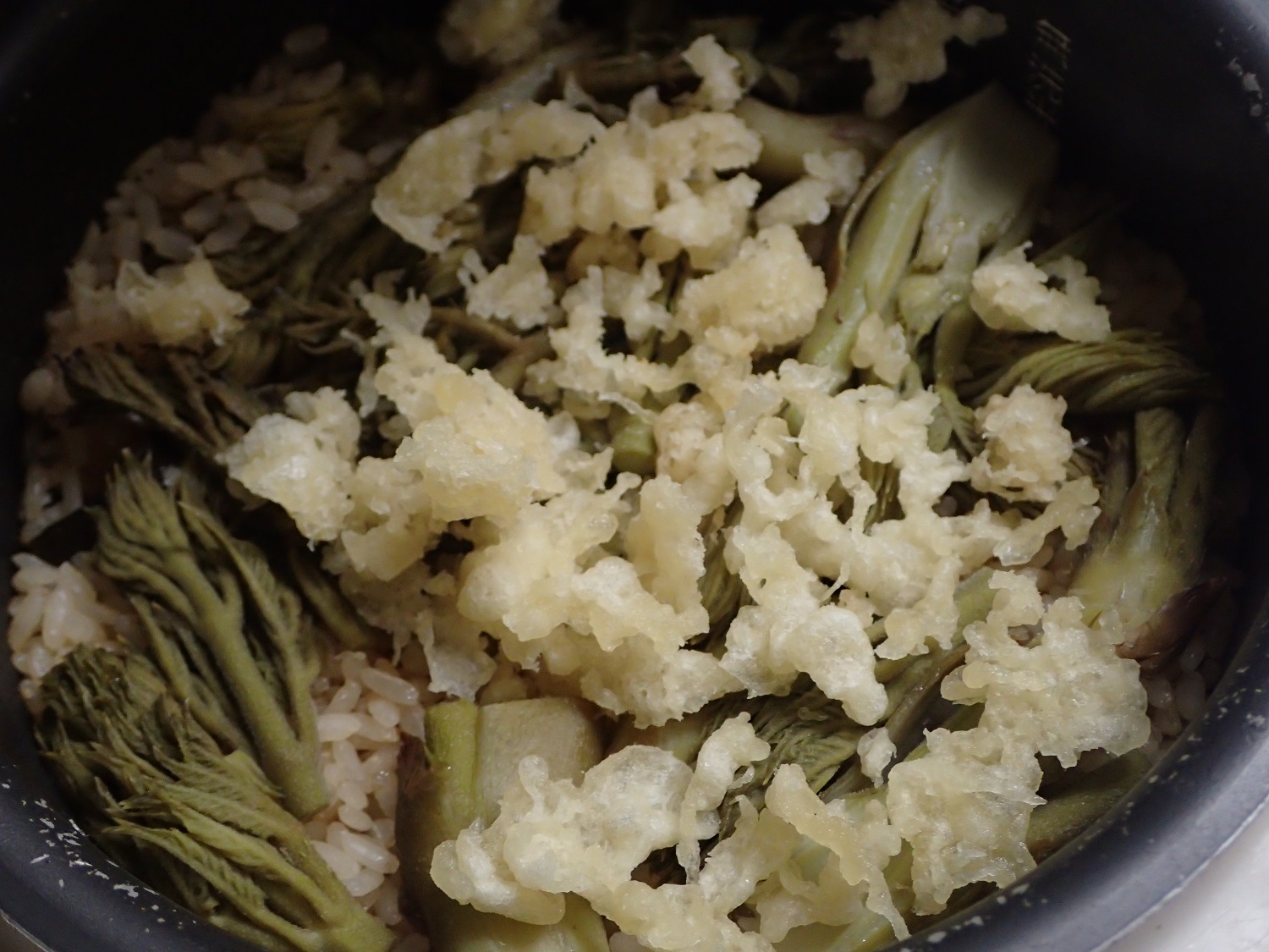 4.炊き上がったところに分量の天かすを入れ、サックりと混ぜてから、ふたをしてしばらく蒸らす。