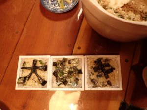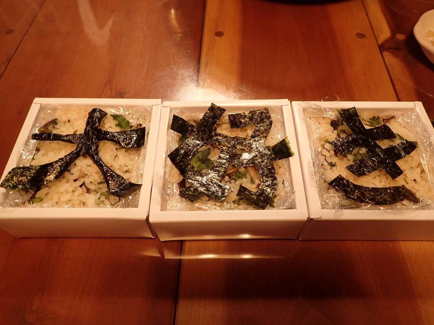 3つの小さな箱に詰め、、、そこに、海苔で何か文字を書いては、、ということになり、、