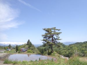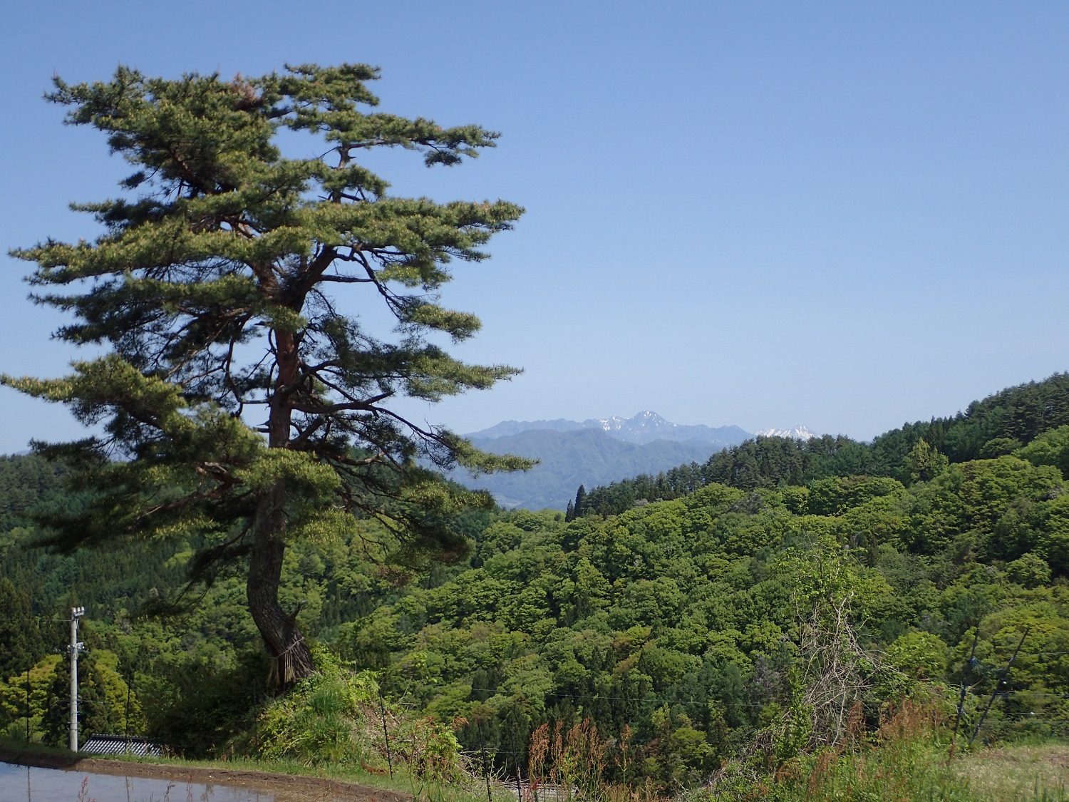 慶師集落の道祖神前広場からは、慶師の一本松の向かって左側に北アルプス白馬三山、右側に戸隠連峰を望むことが出来ます。