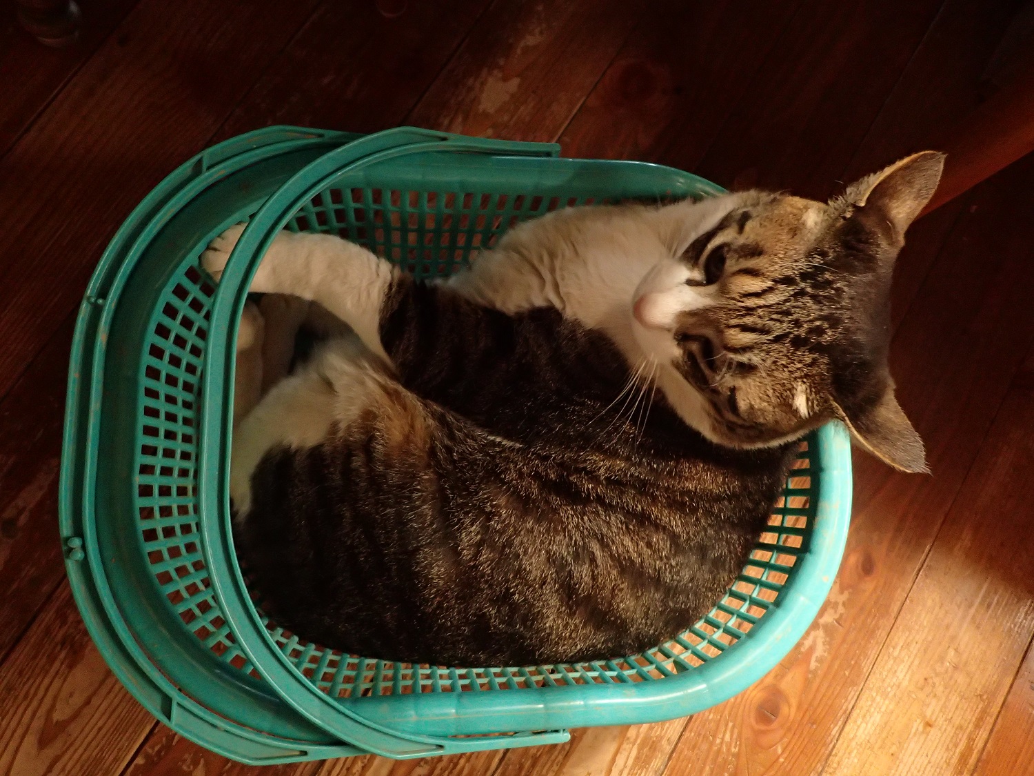 少し肌寒くなってきましたので、母屋に帰ったのですが、居間のストーブの前に置いてあったかごの中に、チビ太んが入っておりました。