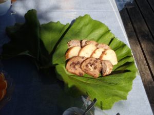 そして、ちょうど「円山町わだつみ」の佐藤料理長さんが遊びに来てくれていましので、お2人のモーニングの際に、佐藤さんの遊び心で、大きなフキの葉に、まめぱんさんのパンを包んでお出ししましたです!