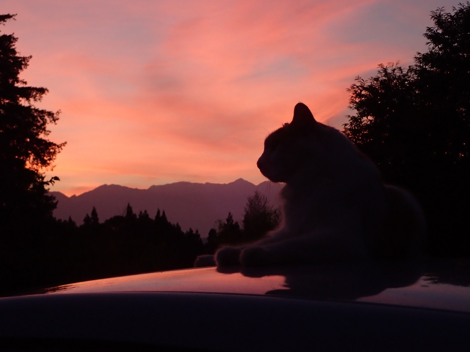 うっすら夕焼け空に、北アルプスの稜線がくっきりと出ていました!