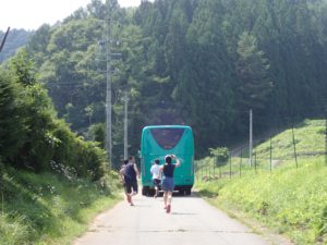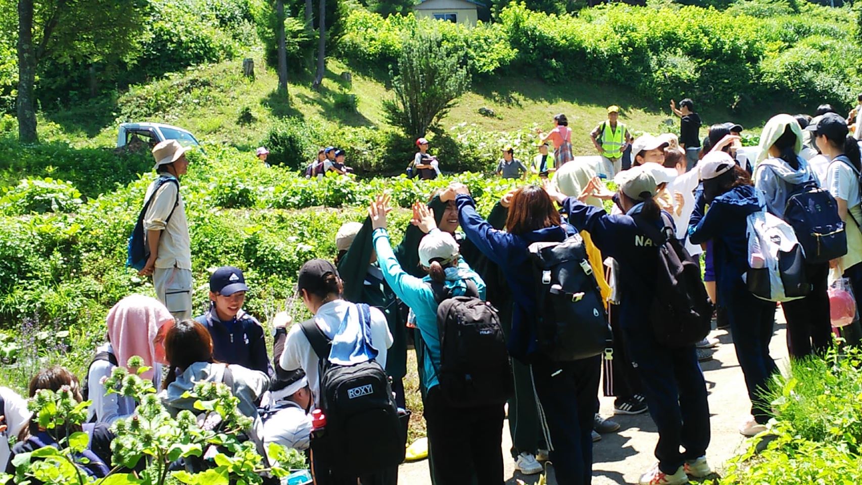 さて、、愛育園の皆さんご到着の7月14日は、長野県立大学健康発達学部の学生さんたちのフィールドワークの日と重なっていましたので、県立大学の皆さん(学生さん、先生方合わせて約80人!)でのお迎えとなりました~!