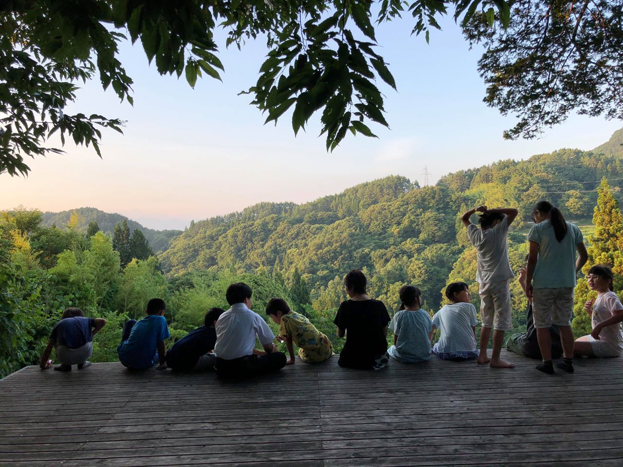 ウッドデッキでくつろぐ子どもたちと、信大教育学部OBのお兄さんたち、、