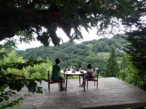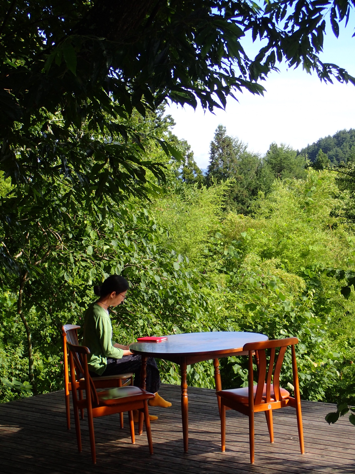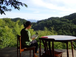 のらCaféウッドデッキを貸し切りで、百年栗の木陰での読書タイムを楽しむお客様です。