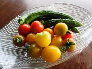 今朝のモーニングには、採れたてのキュウリとミニトマトをそのままに、、
