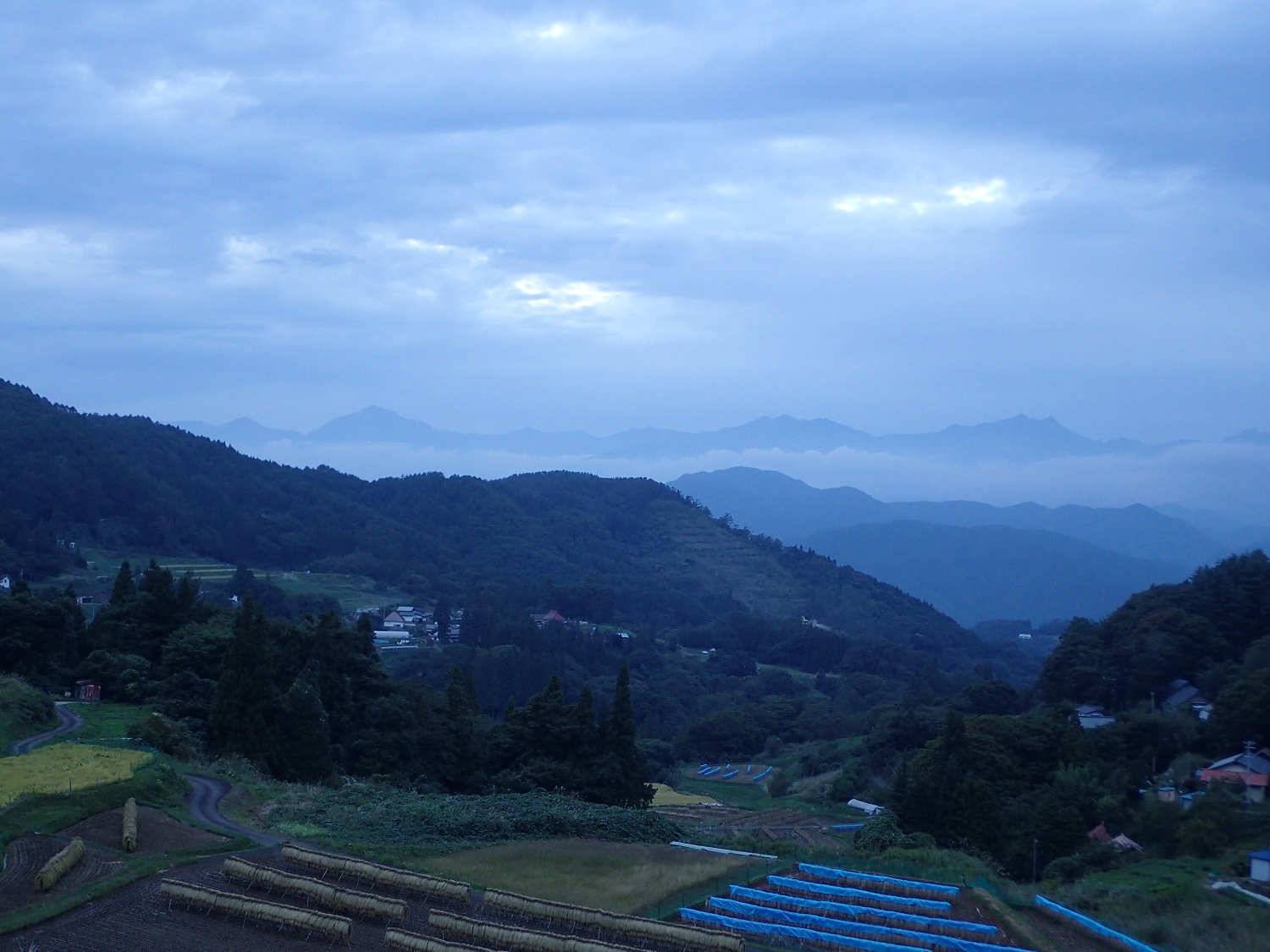 薄暗い中、大岡温泉から、稲刈りが始まった棚田の写真を撮りました。