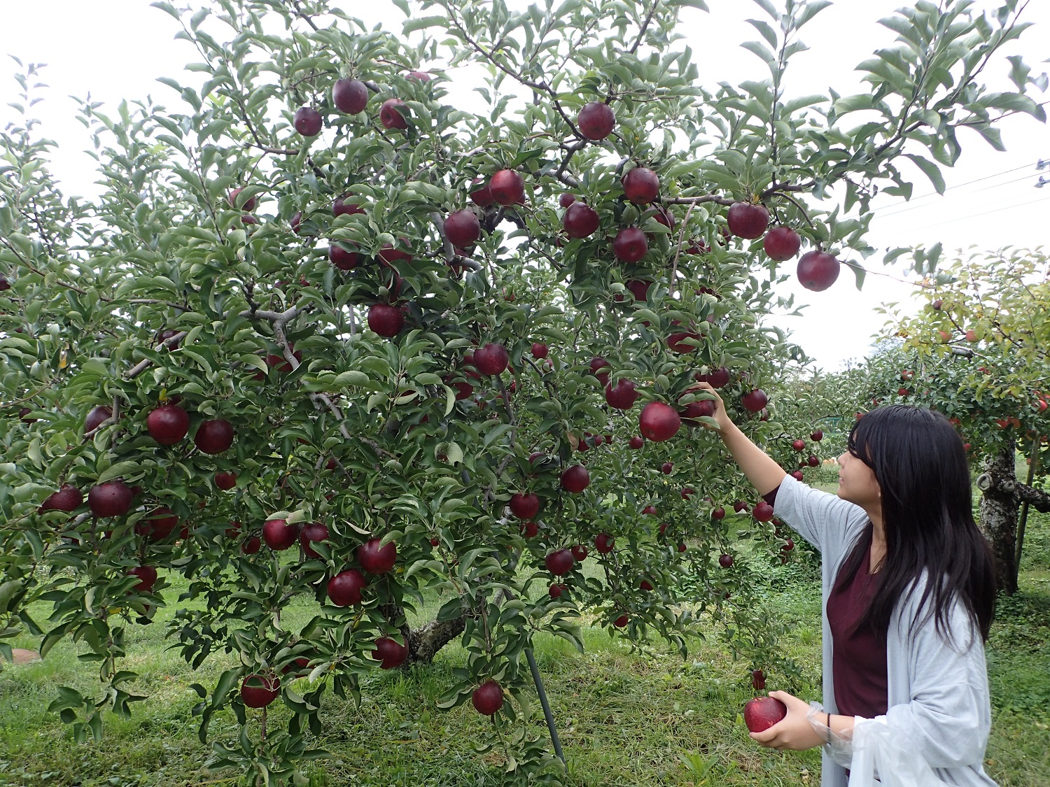 リンゴ園では、今、秋映(あきばえ)がちょうど収穫の適期です。