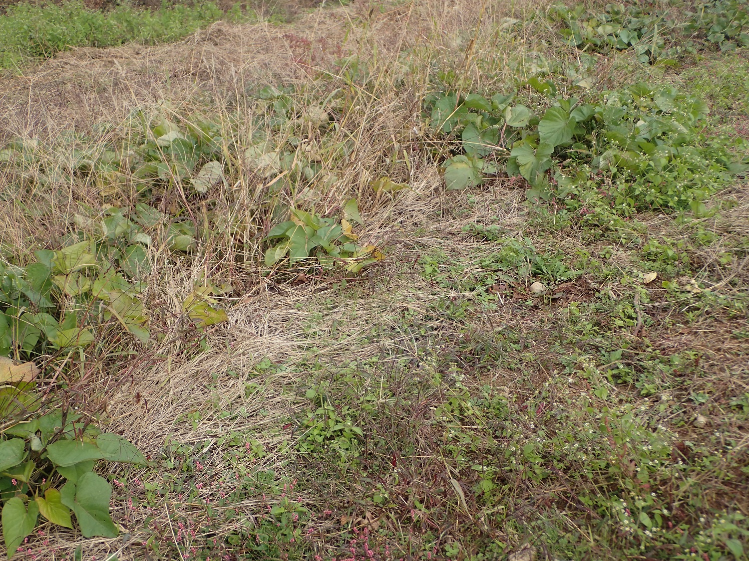 畑のサツマイモの畝ですが、草に埋もれてしまい、サツマイモのツルがどこだかわからなくなってきています。。