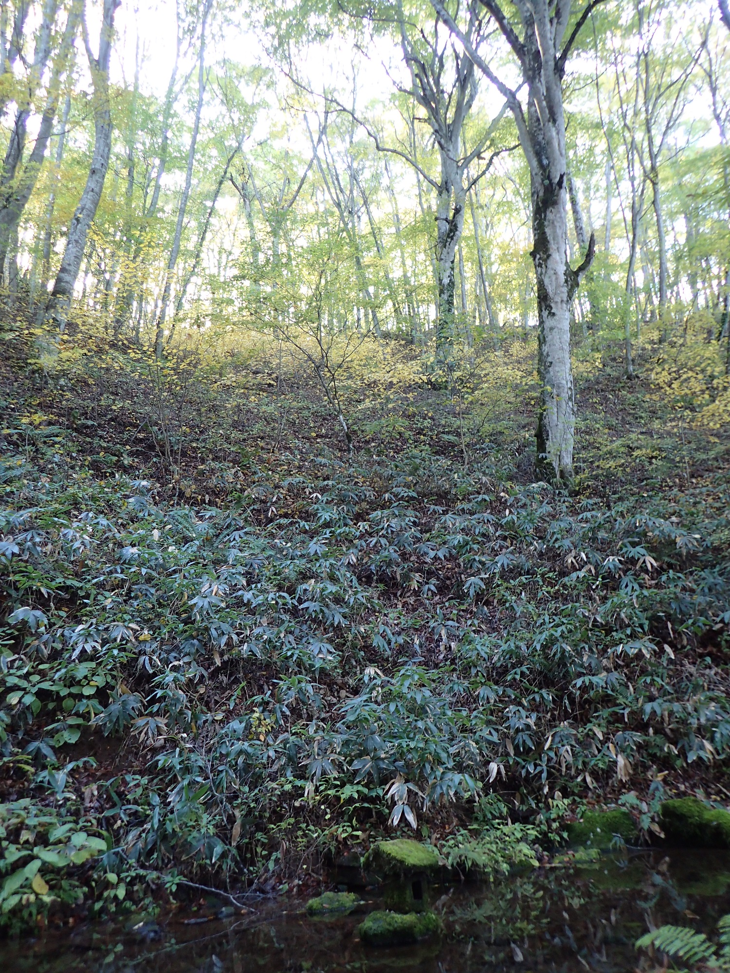 霧が晴れて気がついたのですが、お向かいの山が、少し色付き始めていました。。