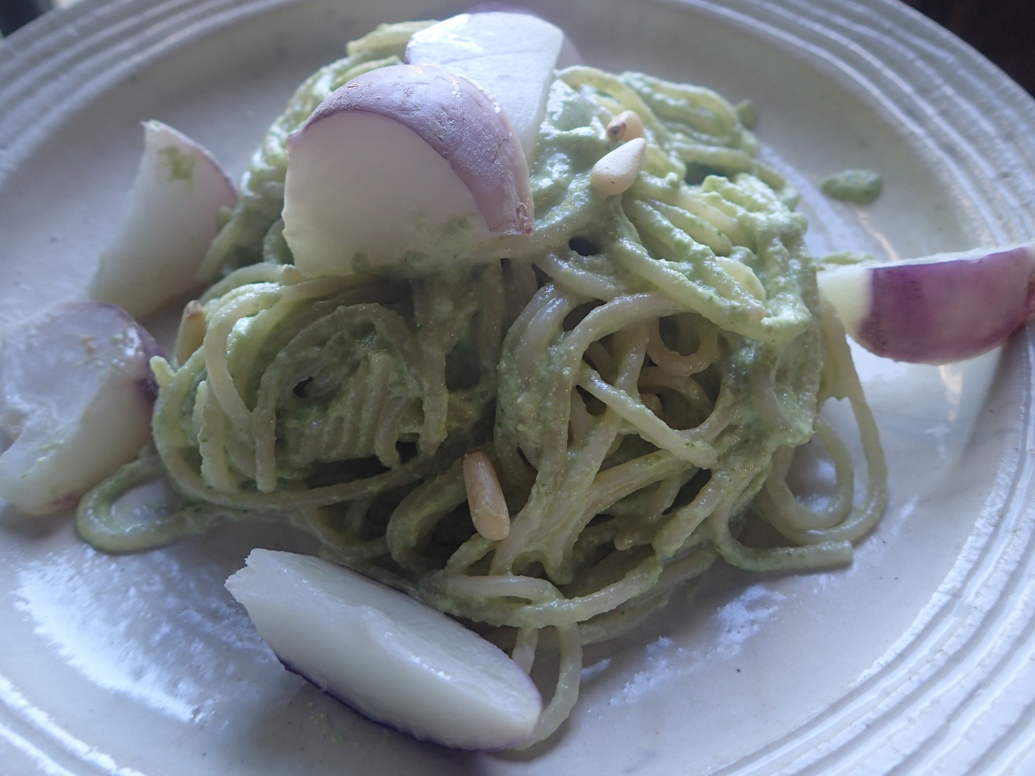 今、秋野菜たちがどれも美味しいのですが、今日のランチのお客様には、木曽紫カブを使いました、カブの葉のジェノベーゼ風のパスタをお作りしました!