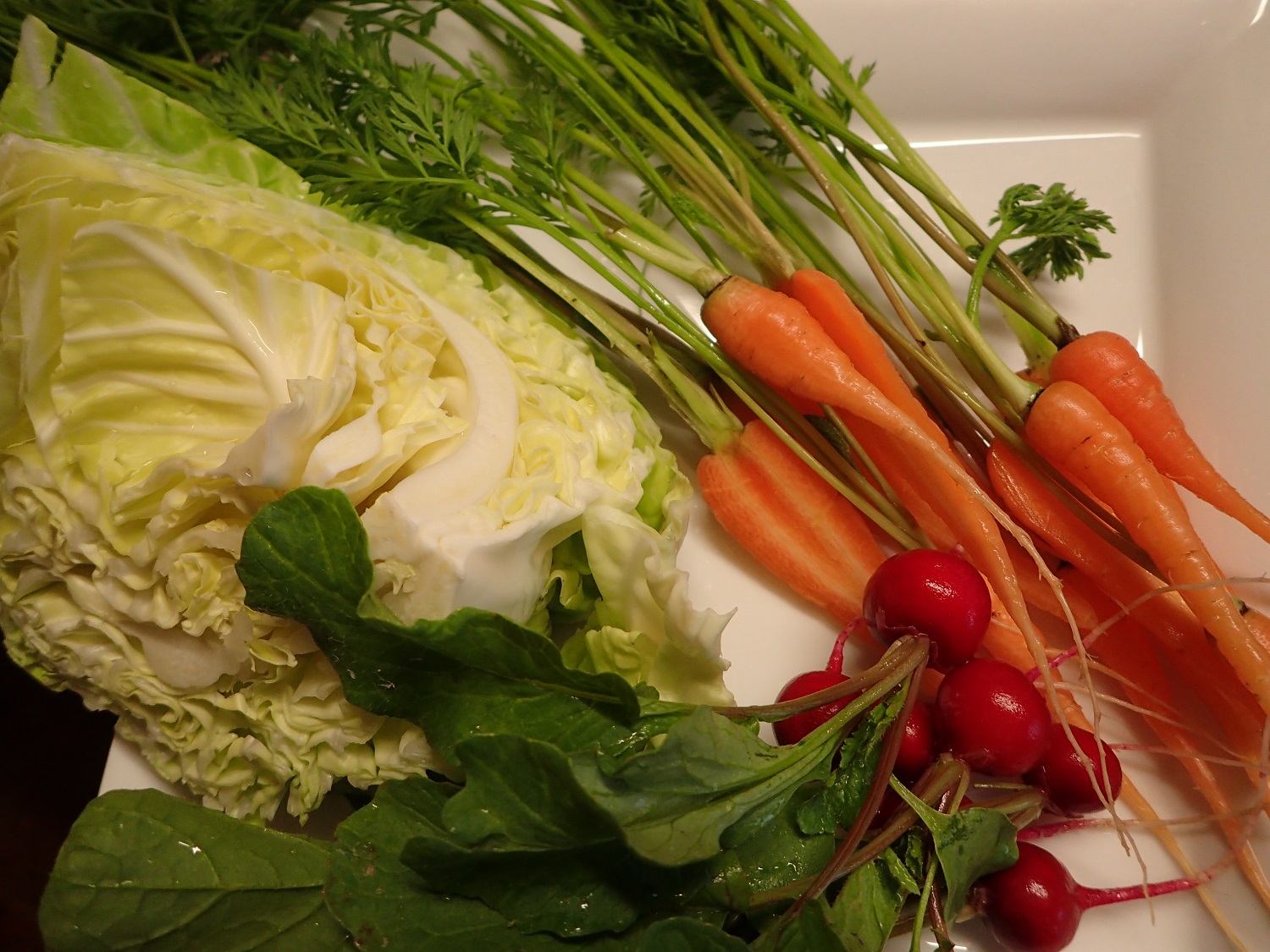 キャベツ、白菜、葉付きニンジン、青長大根、紅芯大根、木曽紫カブ、ルバーブ、小松菜、水菜、ラディッシュ、赤水菜、長ネギ、ルッコラ、カボチャ、ジャガイモ(キタアカリ、アンデスレッド)、ミヤマコカブ間引き、高菜、トクナガサンのリンゴ秋映、