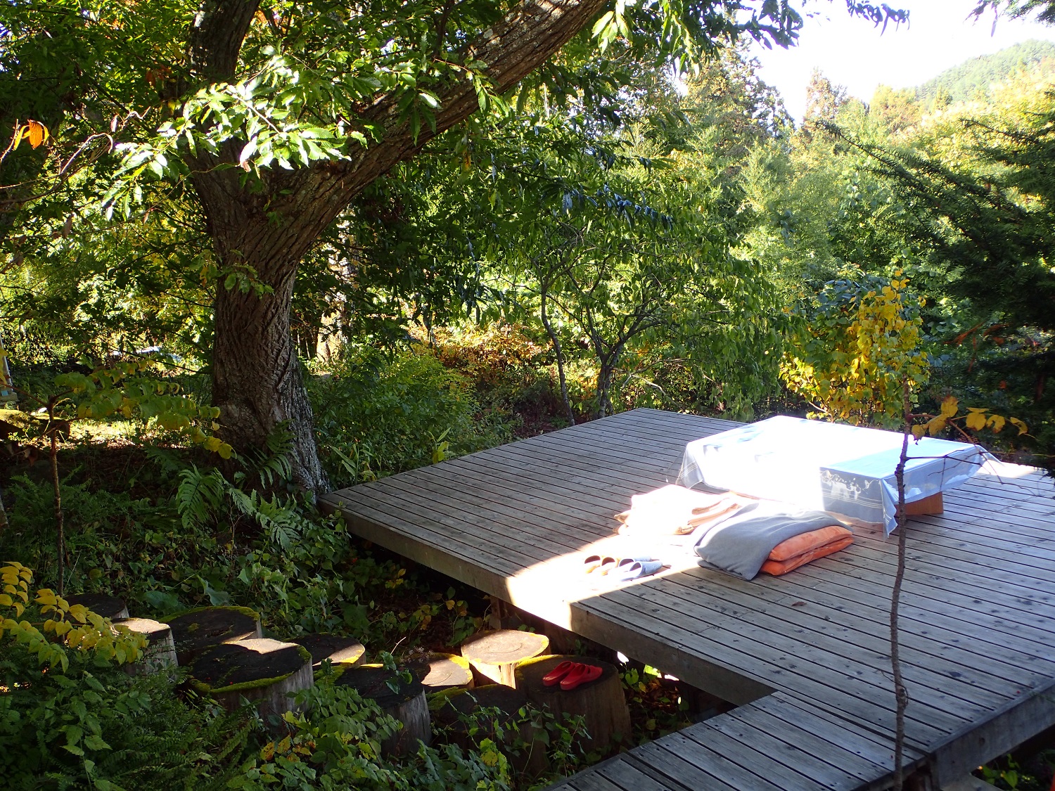ウッドデッキに注がれる木漏れ日も、スポットライトのよう、、