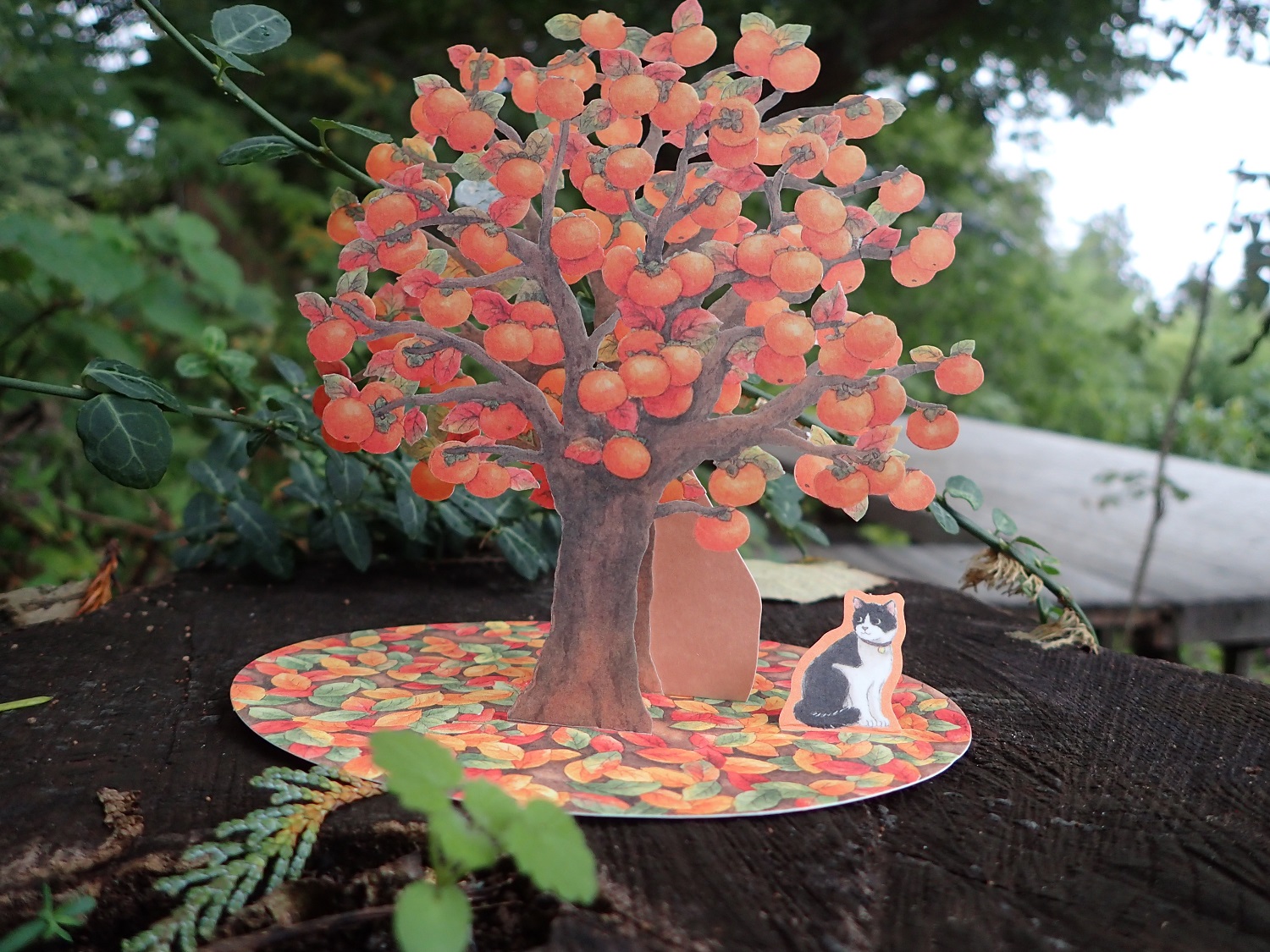 柿の木の下に、可愛い猫ちゃんがいるイラストです!