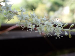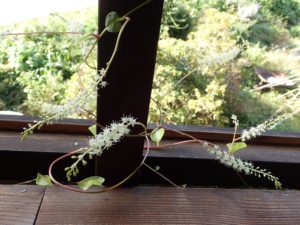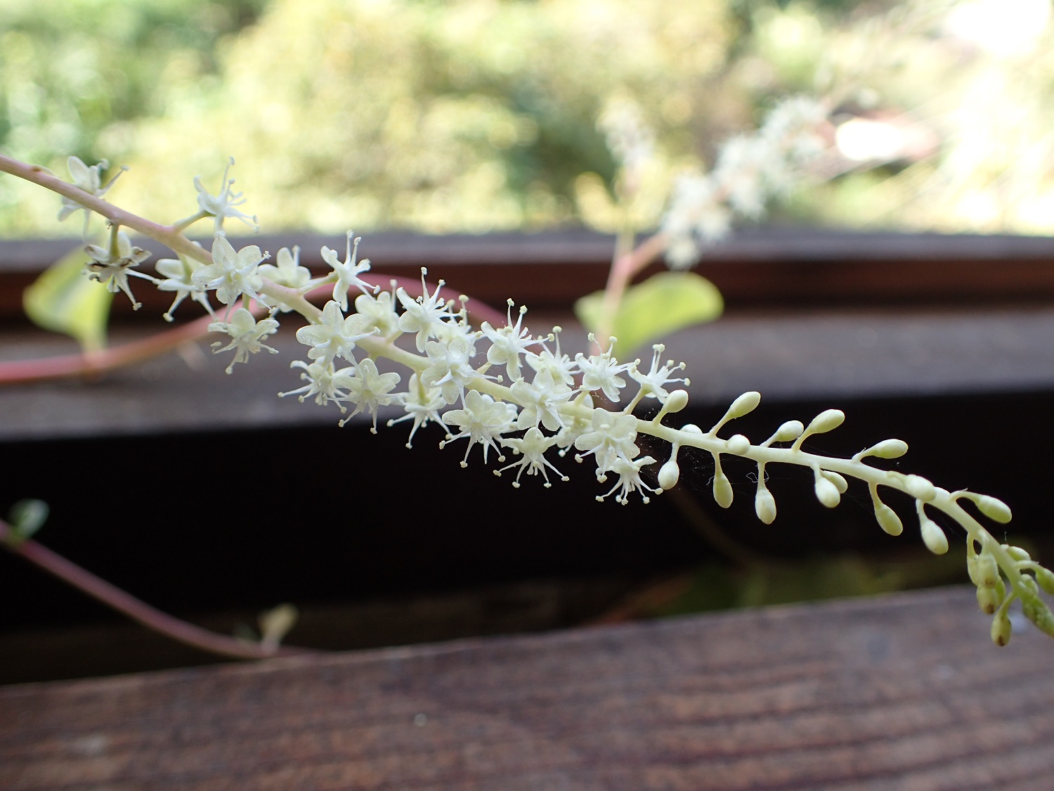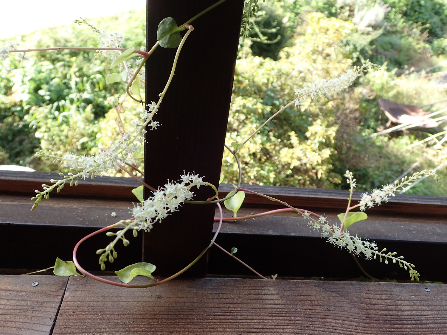 ゆでると、肉厚のワカメのような食感でお浸しや酢の物にして美味しいのですが、そのオカワカメのツルが2階まで伸びまして、花を咲かせていました!