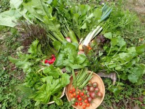 青長大根、紅芯大根、大根間引き菜、葉付きニンジン、野沢菜(蕪付き)、長ネギ、ルッコラ、赤水菜、高菜、ラディッシュ、バジル、スイートフェンネル、イタリアンパセリ、インゲン、ミニトマト、ジャガイモ(キタアカリ・アンデスレッド)、、