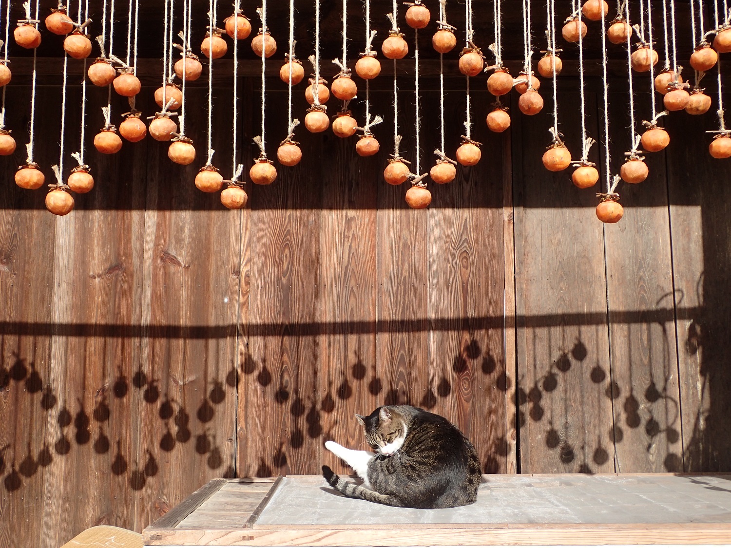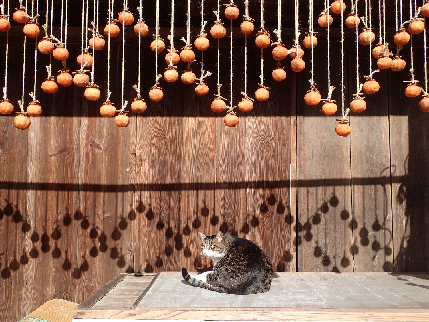 農村、田舎、縁側、干し柿、猫、、