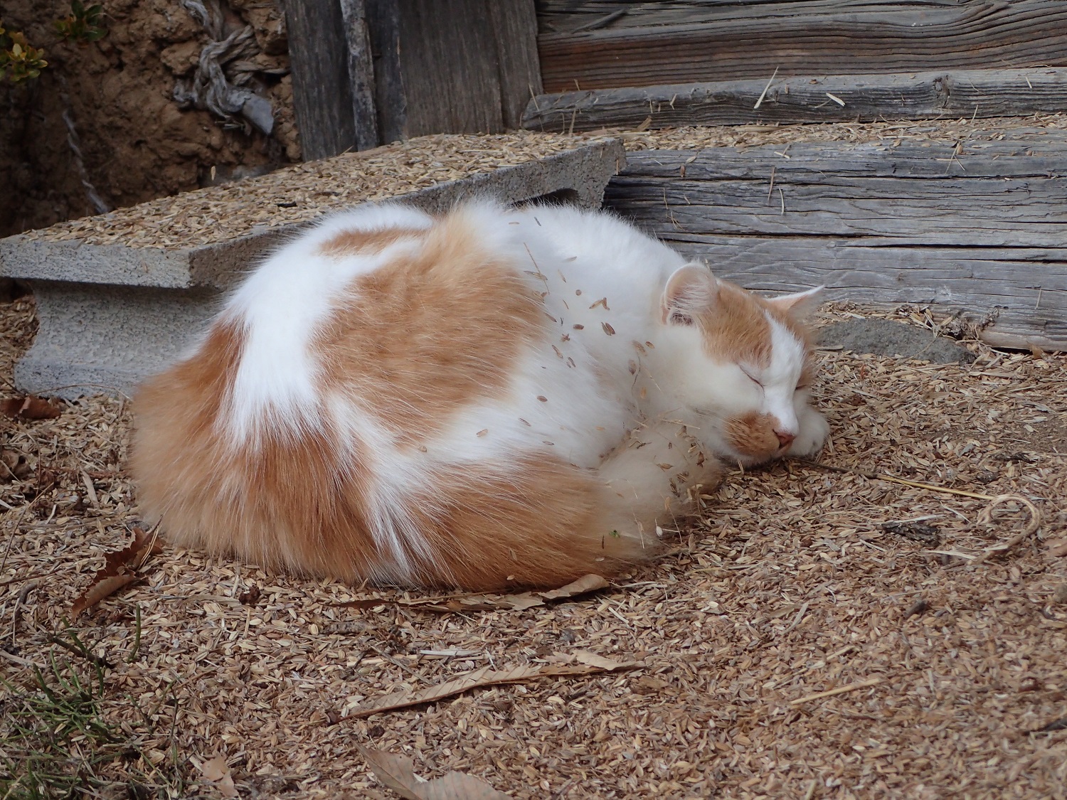 写真は、土蔵の前で丸くなって眠っているミコ太。