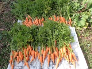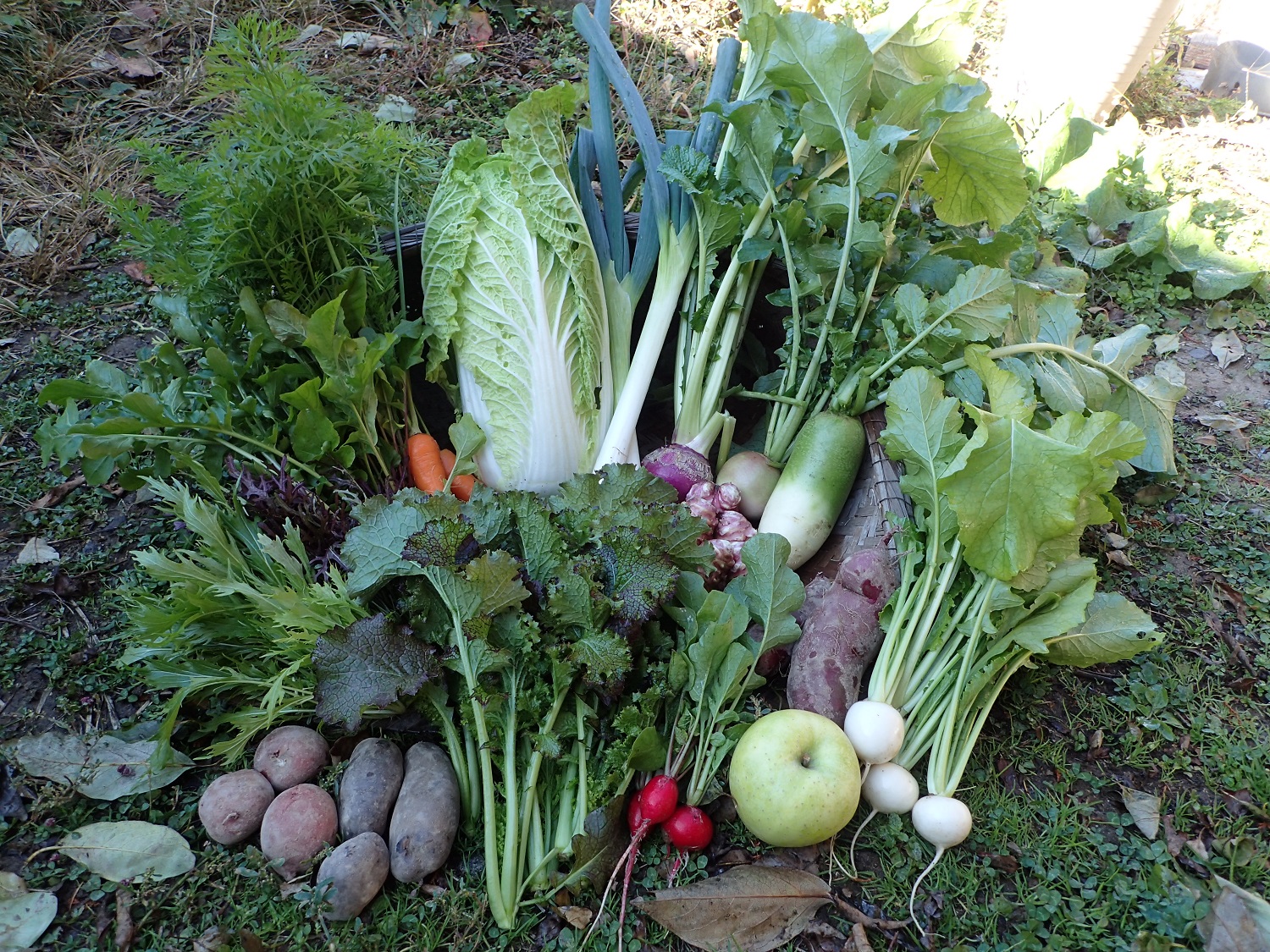 生でサラダで美味しい白菜!、葉付きニンジン、木曽紫カブ、青長大根、紅芯大根、みやまこかぶ、ルッコラ、ミズナ、赤水菜、サラダ野菜のパープルウエーブマスタード(←これ、美味しいです!)、ラディッシュ、サツマイモ(スイートパープルロード)、トピナンブール(赤キクイモ)、ジャガイモ(アンデスレッド、シャドークイン)、長ネギ、トクナガさんのリンゴ王林!