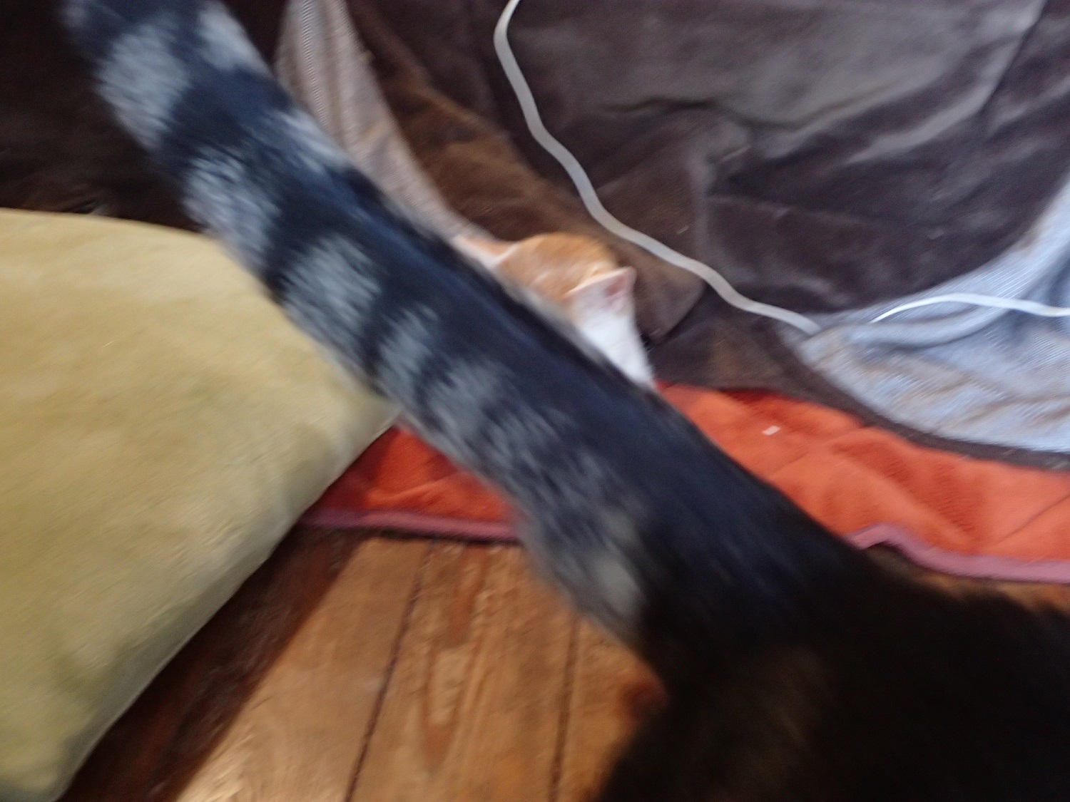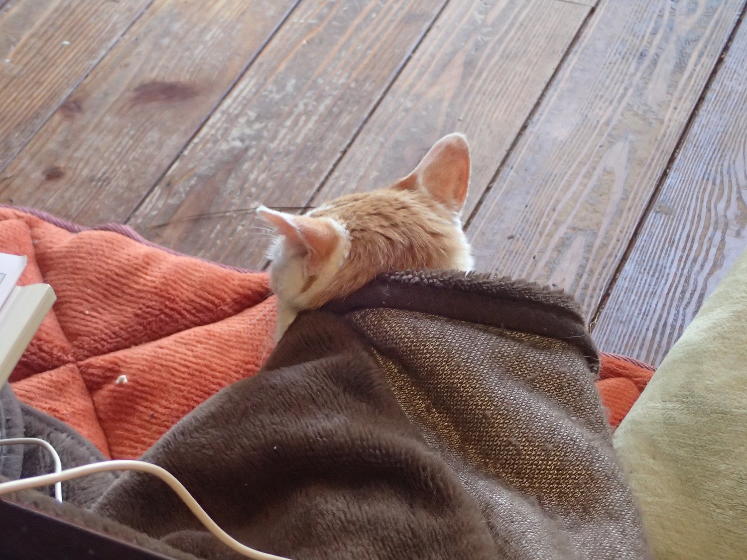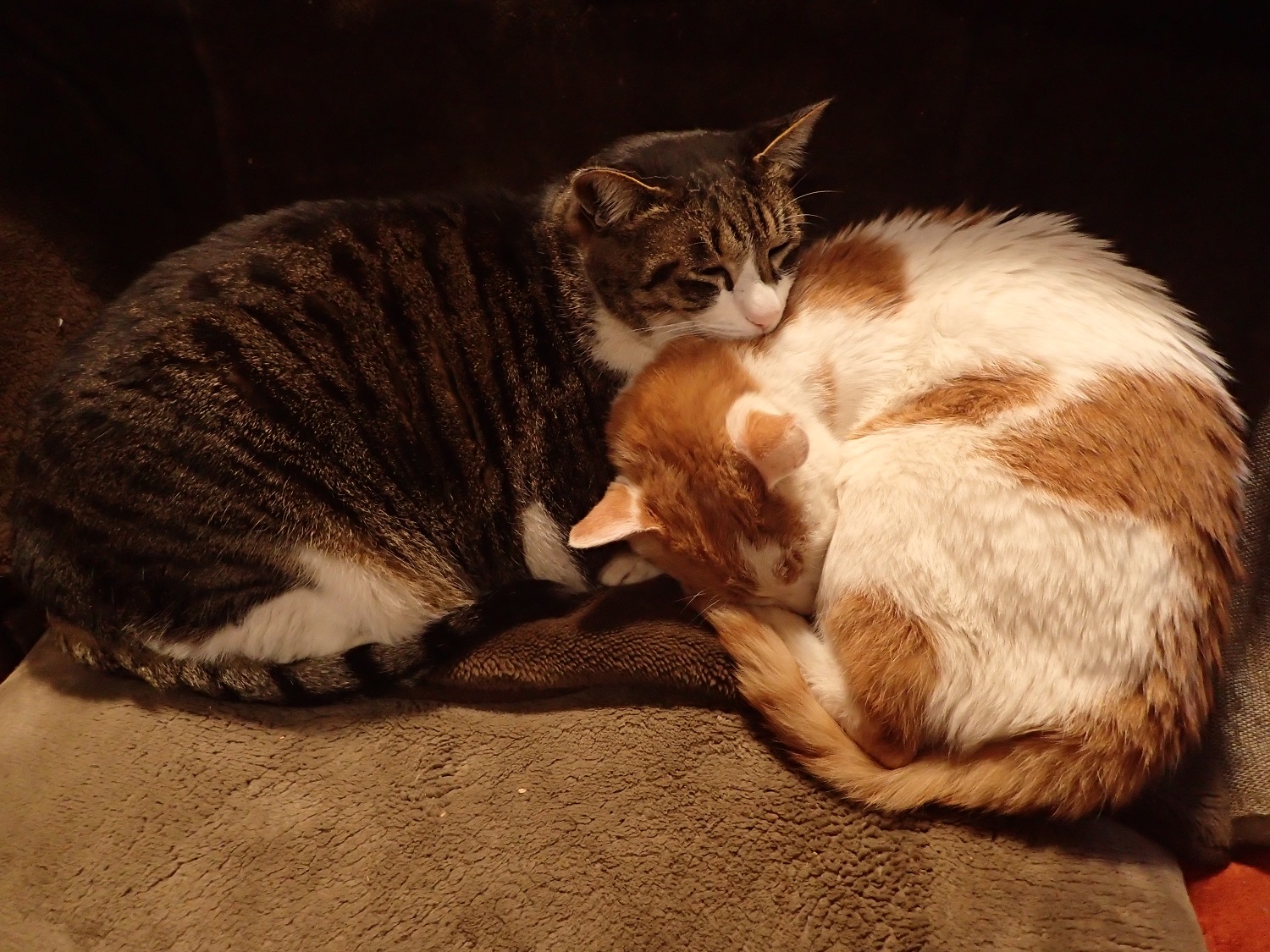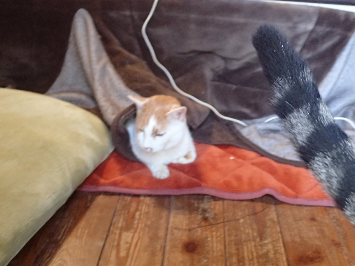 こたつのヘリで、身体を寄せ合う長男猫のチャイと、二男猫のチビ太です。。