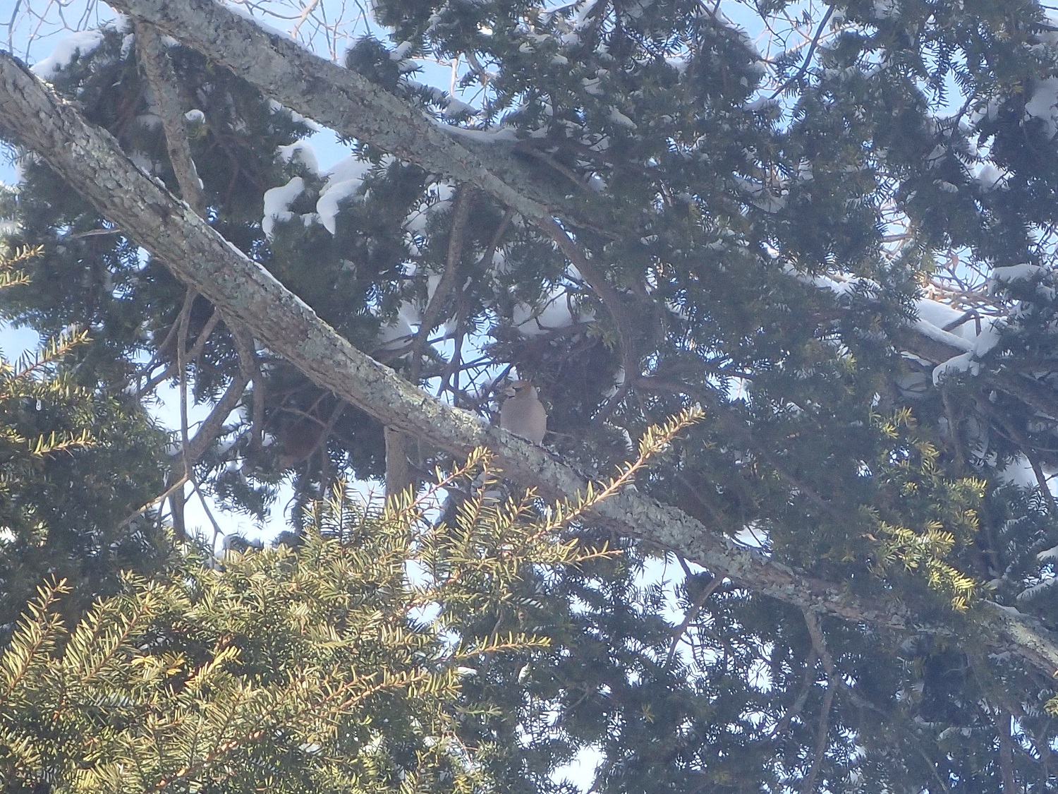 そんなこんなで、頭もぼーっとしてあまり活動できていないのですが、今日はこたつに入ってポケ~ッとしながら窓から外を見ていたところ、ウッドデッキの中央にそびえている大きなイチイの樹に、いろいろな野鳥たちが来てくれているのに気がつきました!