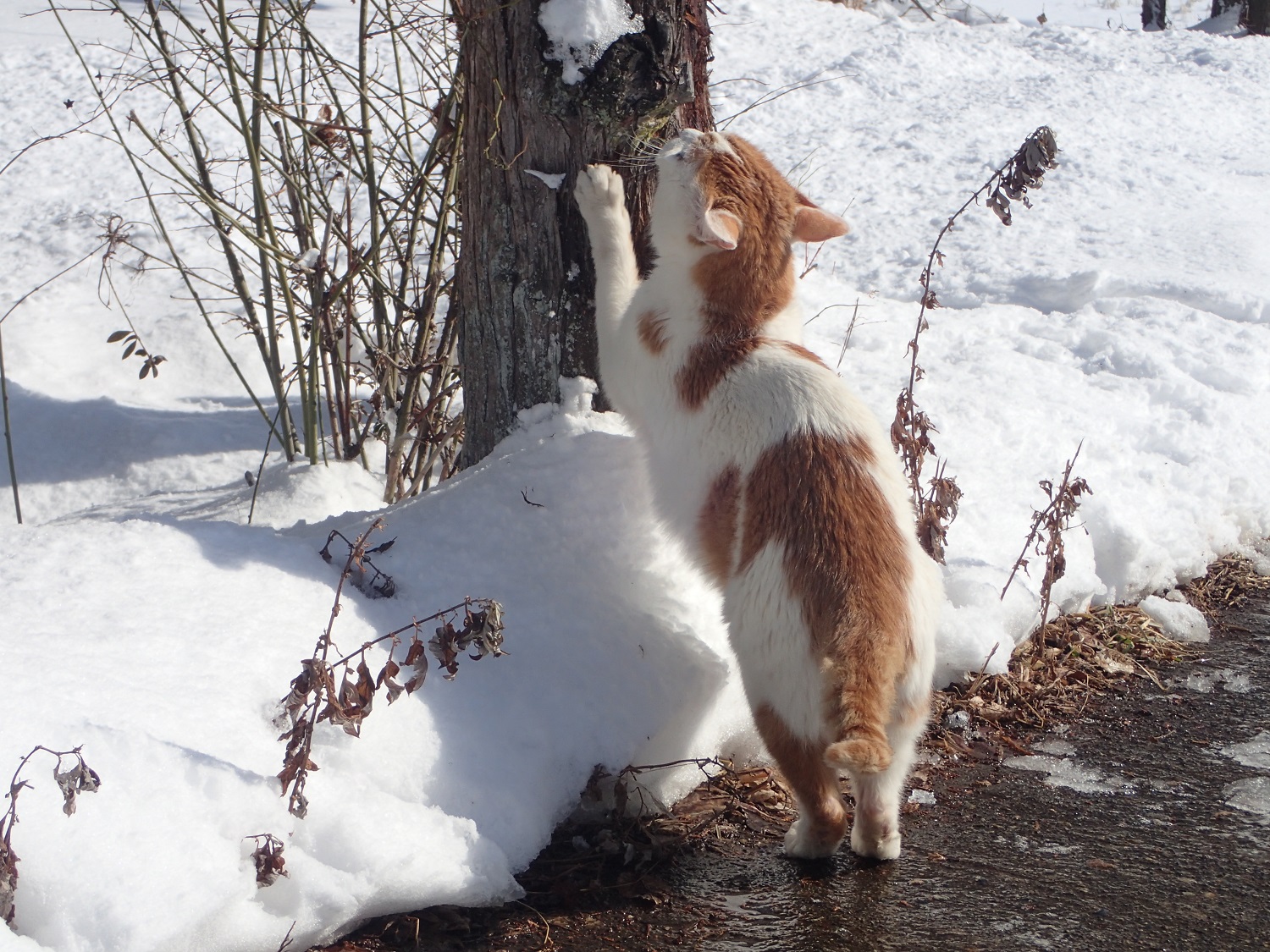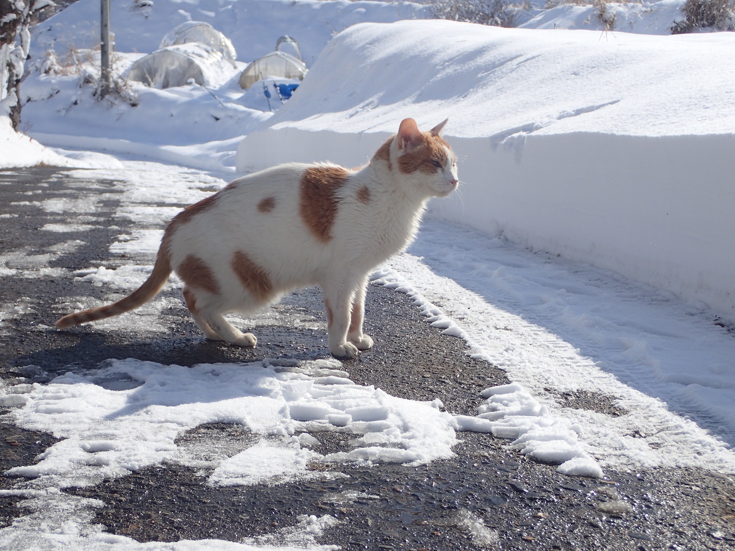 やはり雪の上は肉球が冷たいのか、日当たりの良いところでは、除雪されたアスファルトの上を選んで、ジグザグに歩いていましたよ!