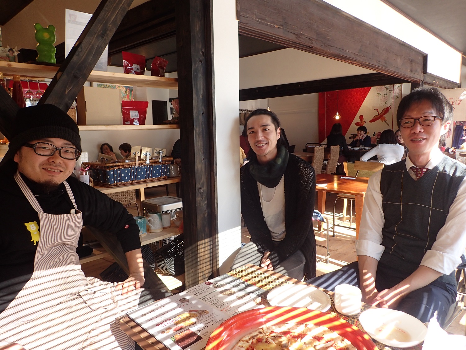 美味しいピザを頂きながら、ねこぽぽ代表の北澤さん、スタッフの小坂さん、ご一緒してくださいました中澤さんと、楽しいおしゃべりが弾みました!(あ、この写真なら、ピザの大きさがおわかりになるかも!)