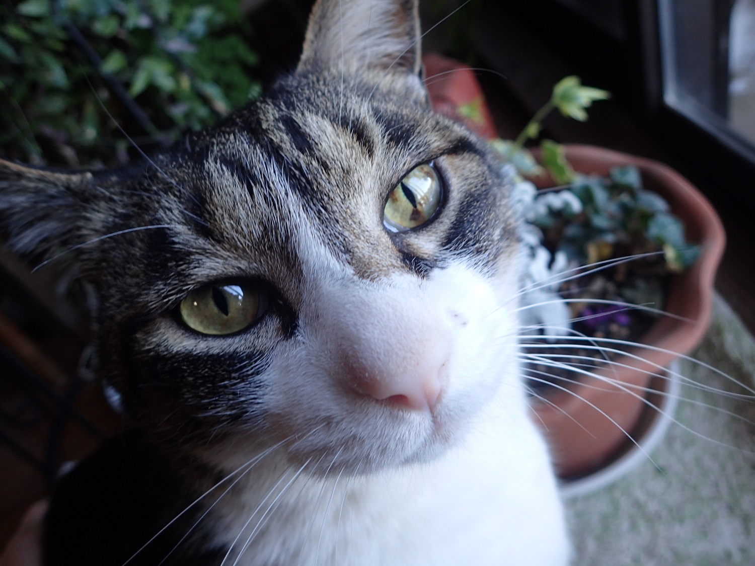 シメのオスは、アップで見ると、目の周りのアイラインがのど元まで続き、ちょっと見「悪役」!?といった風情で、これは凶器になる!、というくらい頑丈そうなくちばしも備えているのですが、ちょっとトロイところもあるのか、時々、にゃんこたちに捕らえられて来ることもあります。。