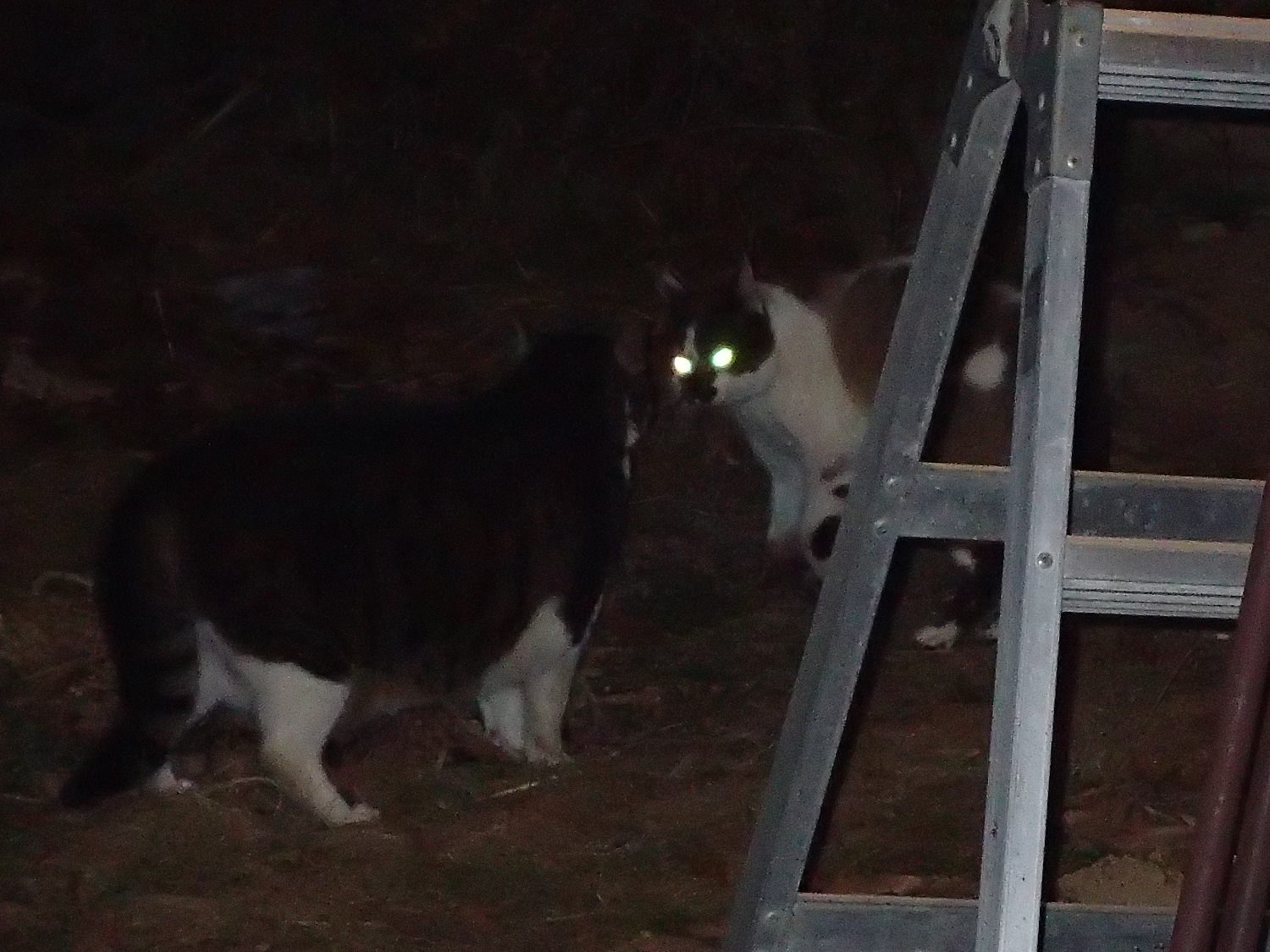 外で、大きく低くうなる声が聞こえたので、縁側に出てみますと、チビ太と新顔の旅猫がにらみ合っているのでした!