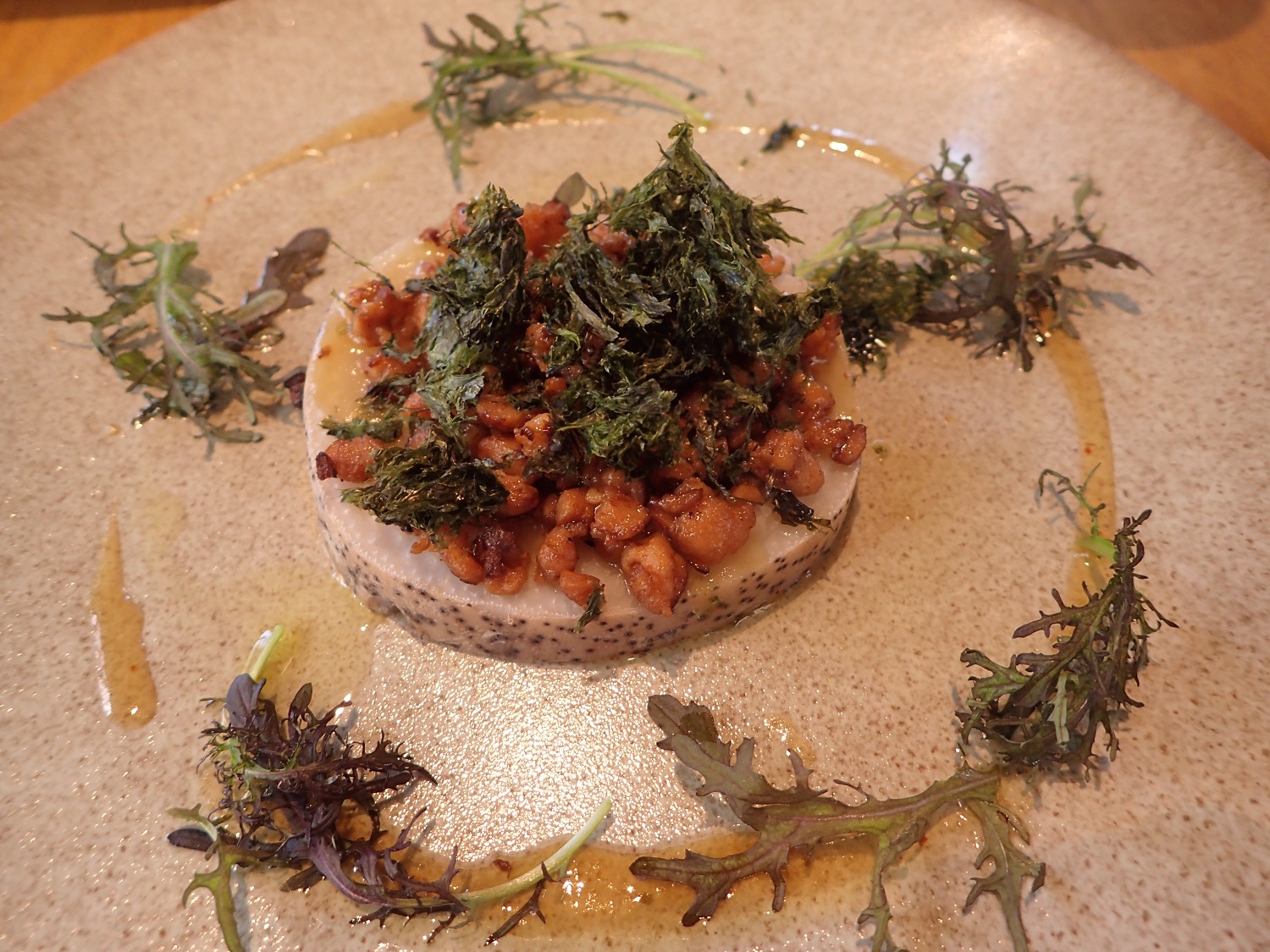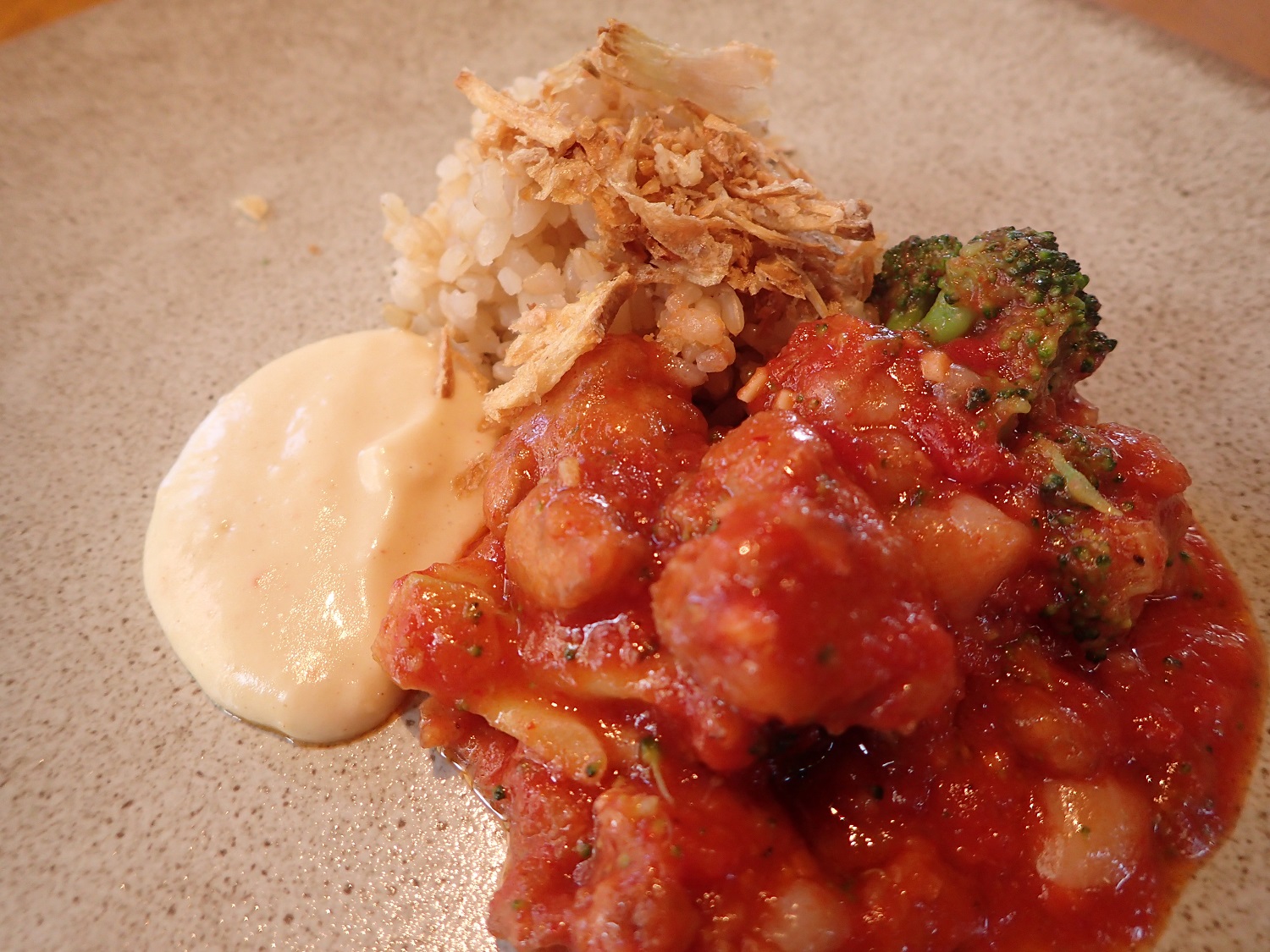 次に、お肉のような大豆たんぱくを乗せたレンコン料理!