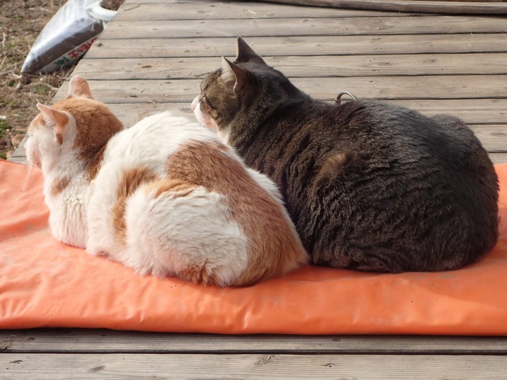 午前10時、、にゃんこたちは一番眠い時間帯です。チャイは作業小屋の2階で、チビ太は居間のこたつの中で、ミコ太は、パソコン椅子の上で爆睡中でした。