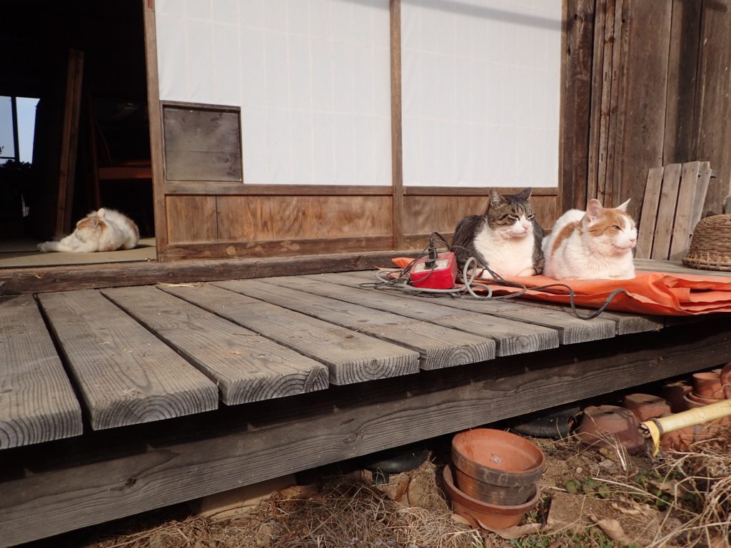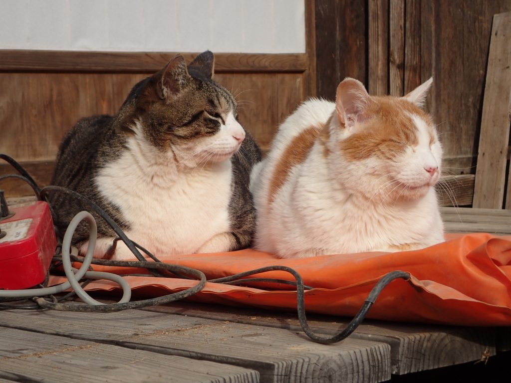 縁側で、チャイとチビ太が仲良く並んでくつろいでいました。