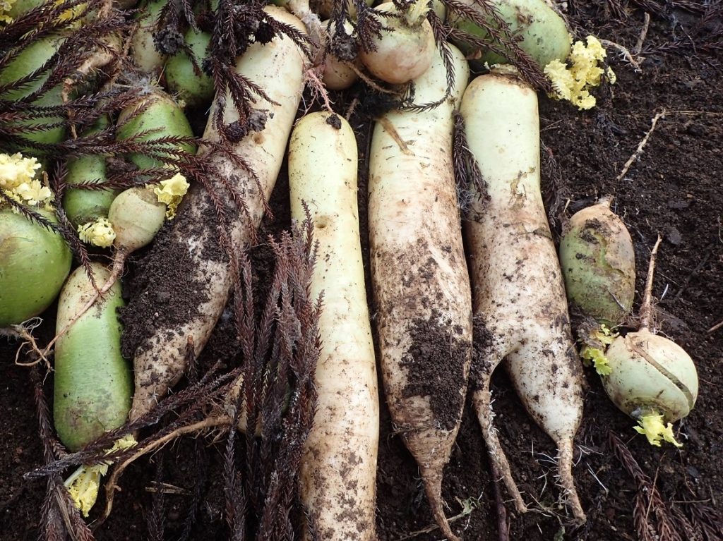 冬の間、土の上に灰を撒いて、杉の葉や栗のイガをかぶせて、貯蔵しておいた大根たち。
