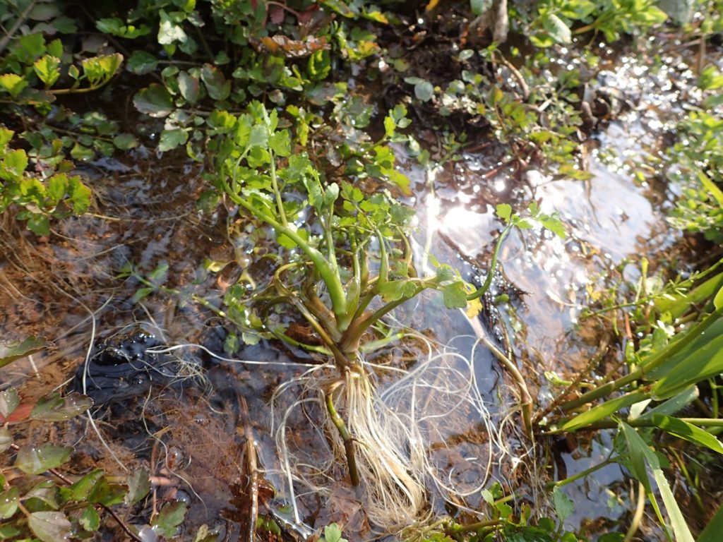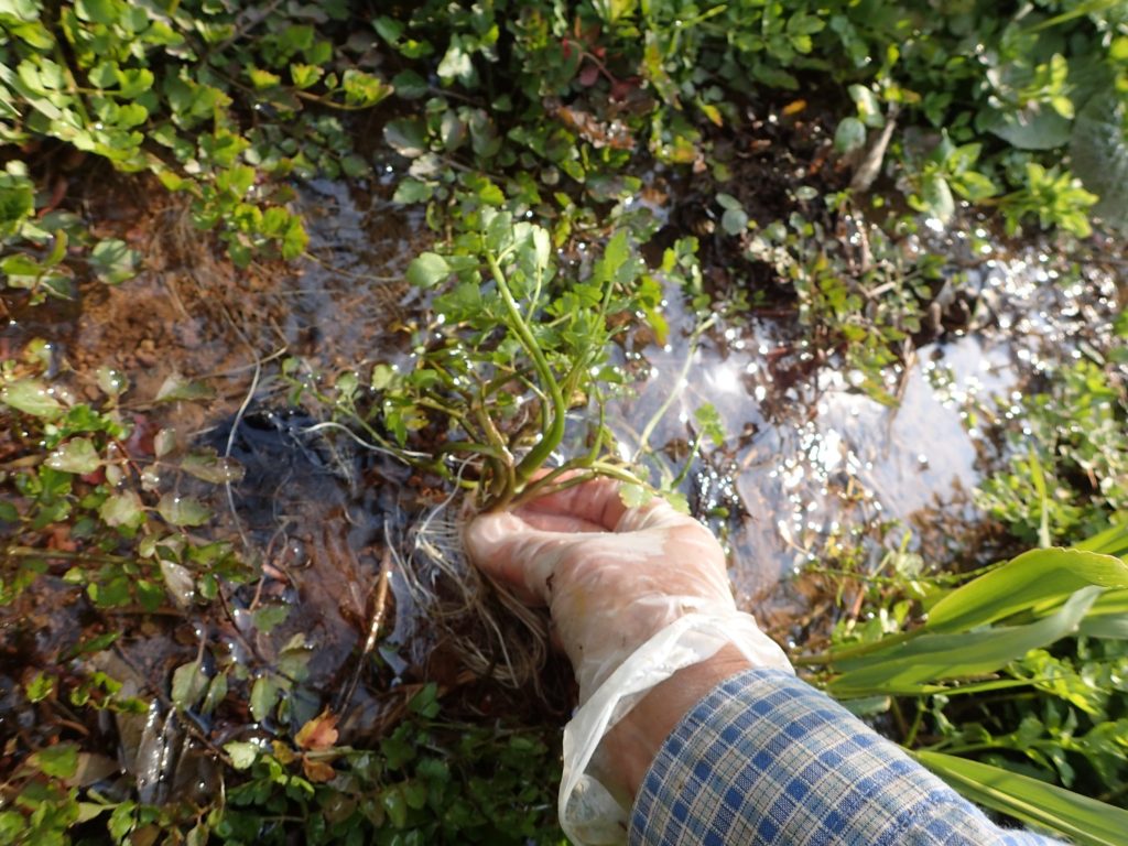 ここで、セリを摘ませてもらい、小さなせせらぎで泥を洗い落とします。