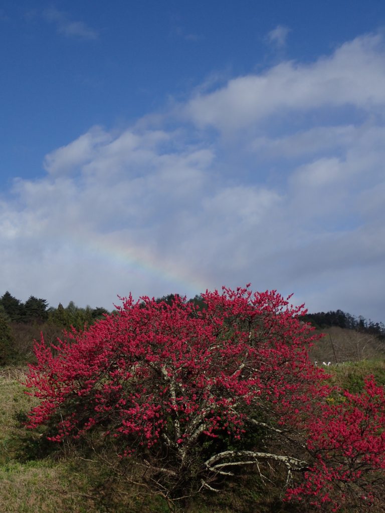 今が満開の花桃(ハナモモ)の背景に虹!