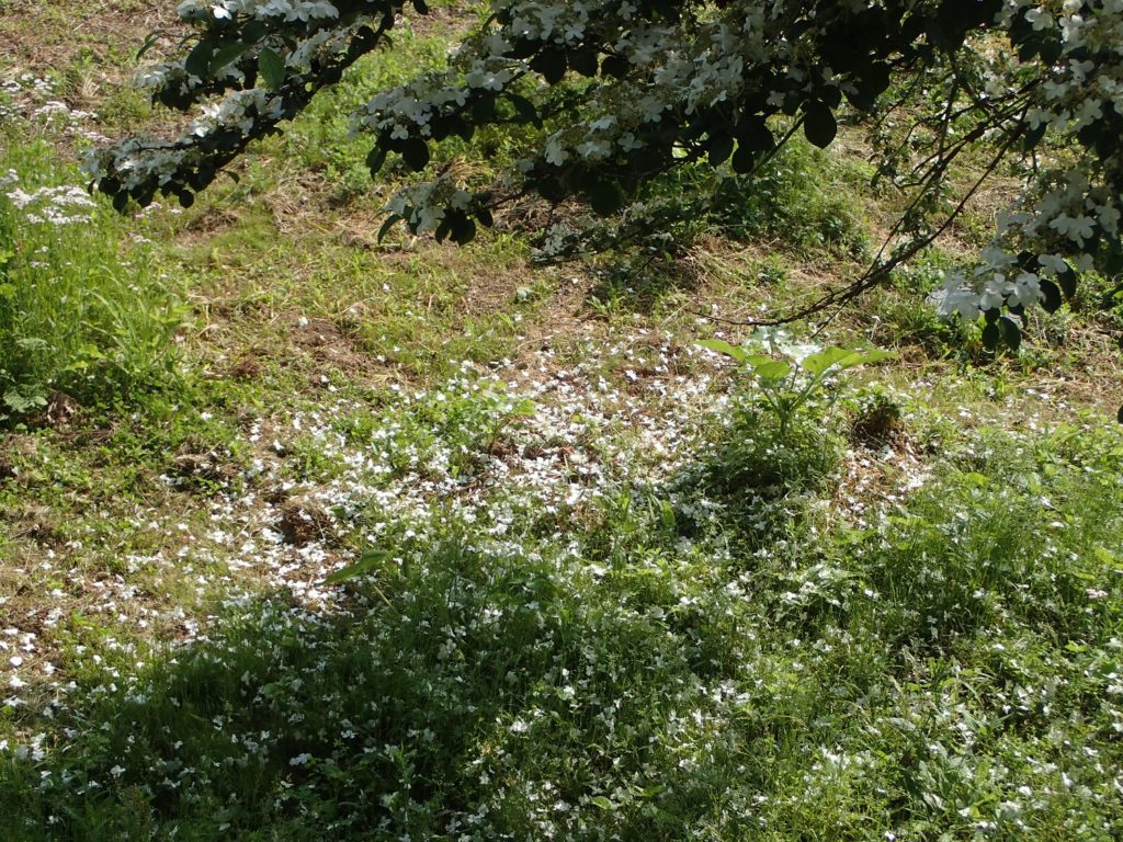 もう少し降り積もれば、下に落ちた花で白いじゅうたんが出来そうですね、、