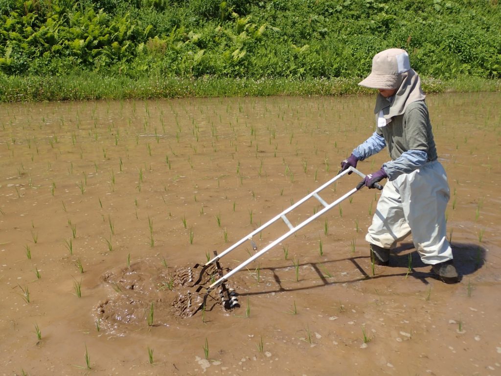 手作業での除草作業なのですが、田車(たぐるま)という道具を使って、生えてきた雑草を浮かしていくのです。