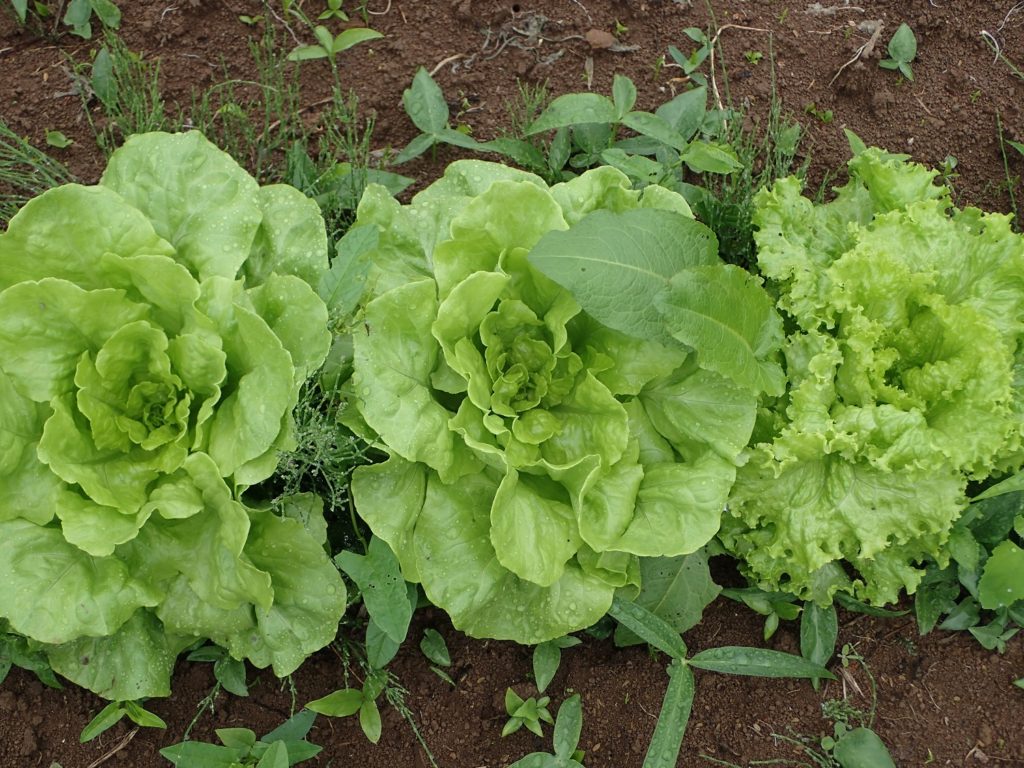 雨の中でも、隣の畝のレタスたちはとてもおいしそうに育っていますね!