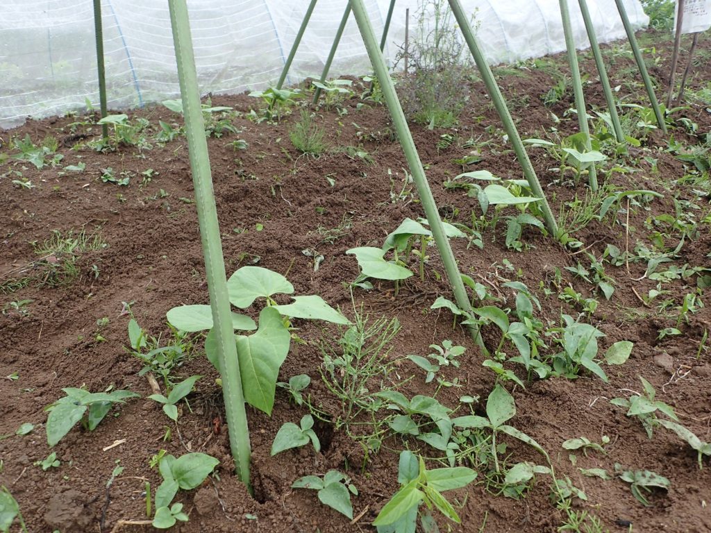 きれいな本葉が出始めていたインゲンにも、支柱を立ててあげようと立て終えたところで、雨がぽつぽつと、、そしてほどなく、本降りの雨になってしまいました。