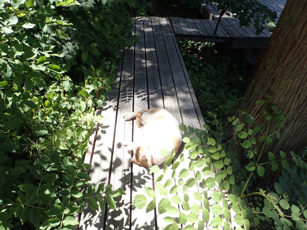 陽射しが少し強いのですが、木陰は涼しいので、半分お日様に当たる感じでお昼寝です。