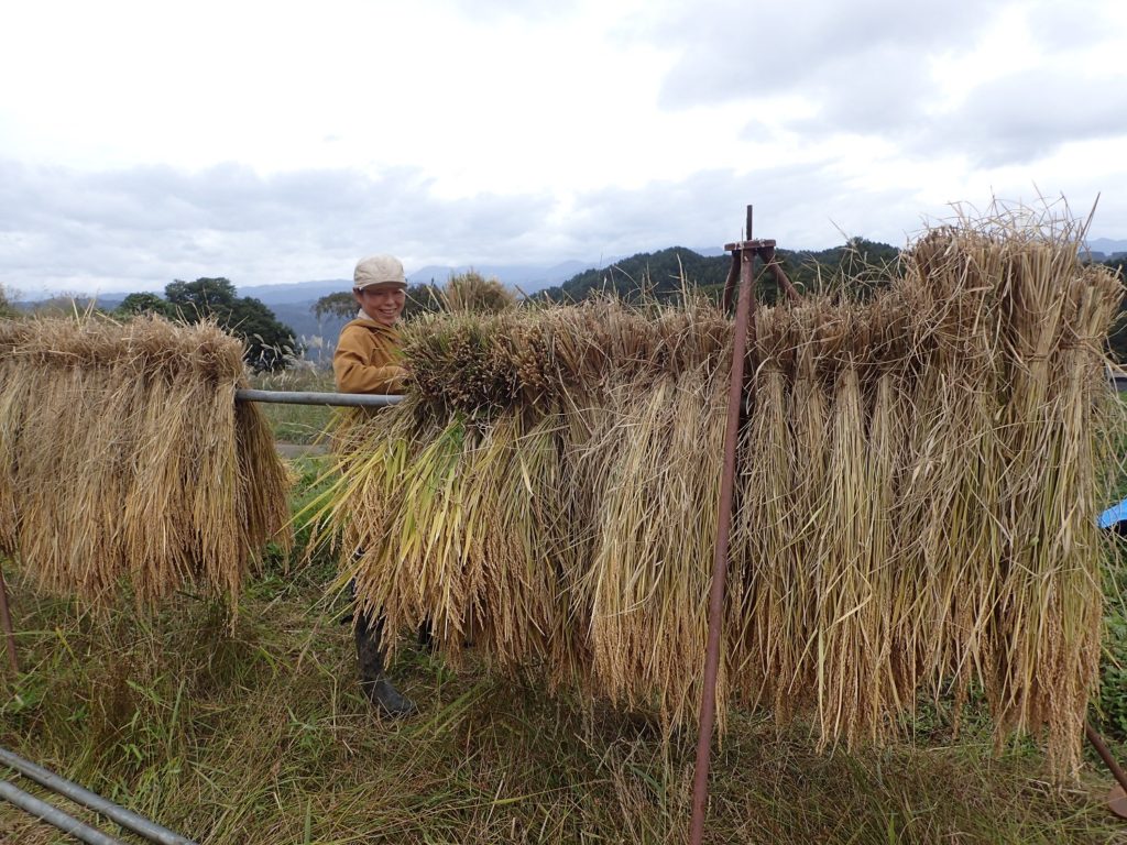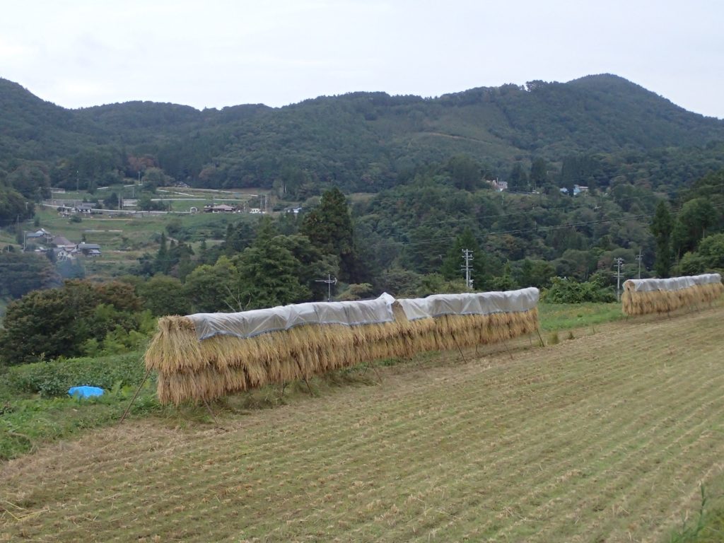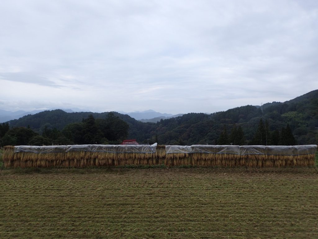 このところ、また天気が芳しくなく、すっきりとした晴れの日が続きません、、ですので、まだ脱穀が出来ず、稲は、はざ掛けをしたままになっています。
