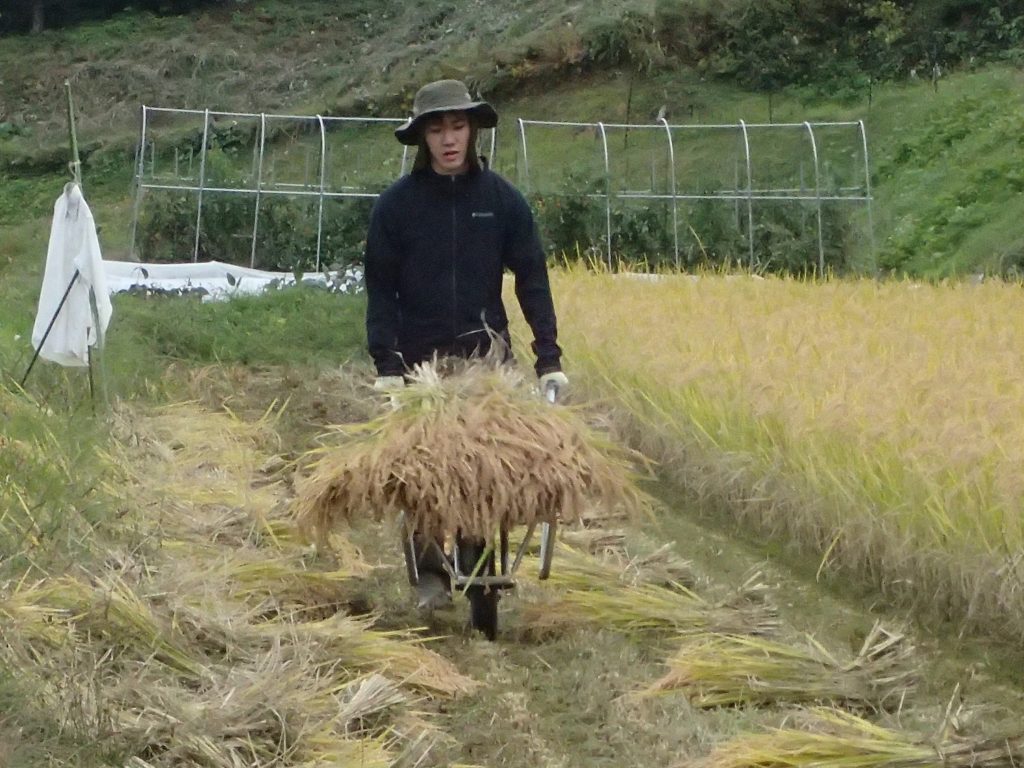 大豆畑にも、田んぼにも、シカが入り始めて食害を起こしていましたので、稲刈りもお手伝いさんをお願いして進めています。