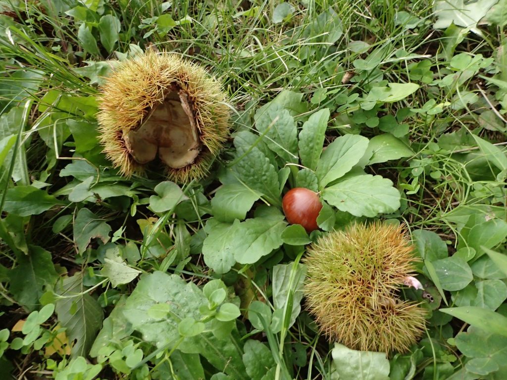 今年は、栗の実が落ち始めるのが例年よりも遅かったのですが、昨日から良い実が一気に落ちてきました!高いところから落ちてくるので、地上では、栗のイガから栗の実が飛び出しています!