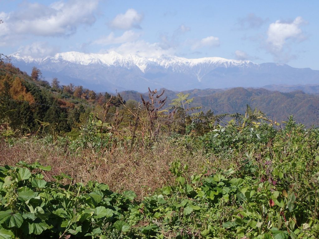 こちらは、秋野菜を育てている畑から、白馬三山を望みました。