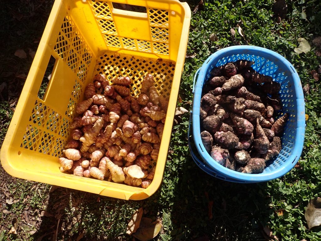 今日掘り上げたキクイモと、聖山の湧き水で洗い終えたキクイモです。