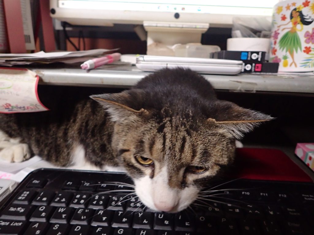 猫は隙間が好きといいますが、チビ太、デスクトップのパソコンのキーボードの裏のスペースに収まっておりました。。