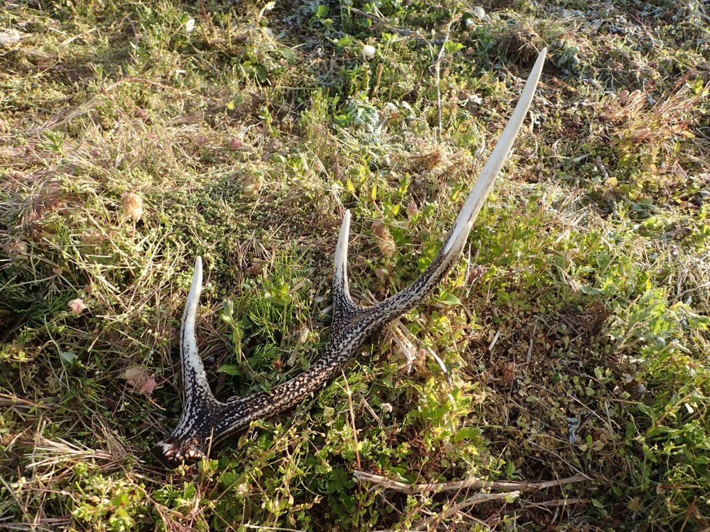 畑で草刈りをしていた際に、長さ60センチ以上もありそうな、大きな鹿の角が落ちているのを見つけました!