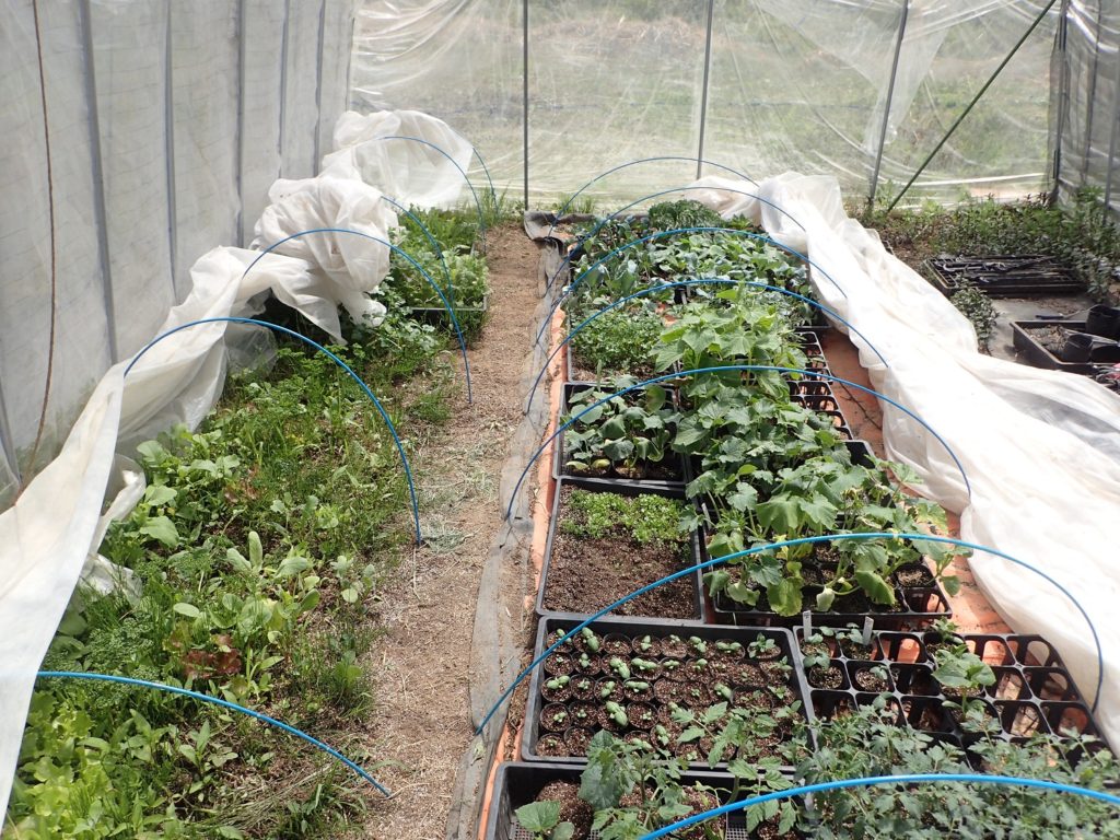 ハウスの中の、移植を待つ野菜の苗たち。