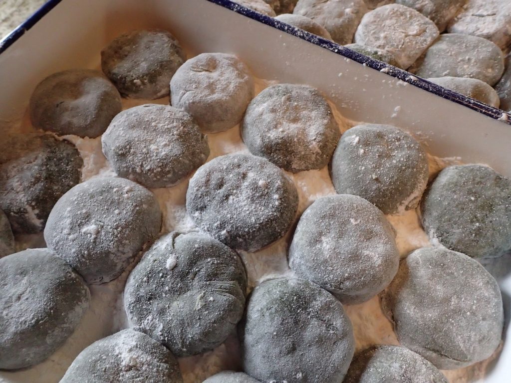 餅取り粉をまぶしながら、中にあんこを入れて丸めていきます。