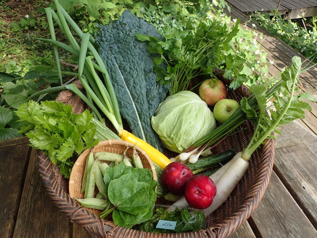 キャベツ、カーボロネロ(黒キャベツ)、ズッキーニ、リーフセロリ、イタリアンパセリ、ミニ大根、ラッキョウ、グリンピース、おかのり、バジル、長ネギ、キュウリ、白キュウリ、トクナガさんの早生リンごとプラム!